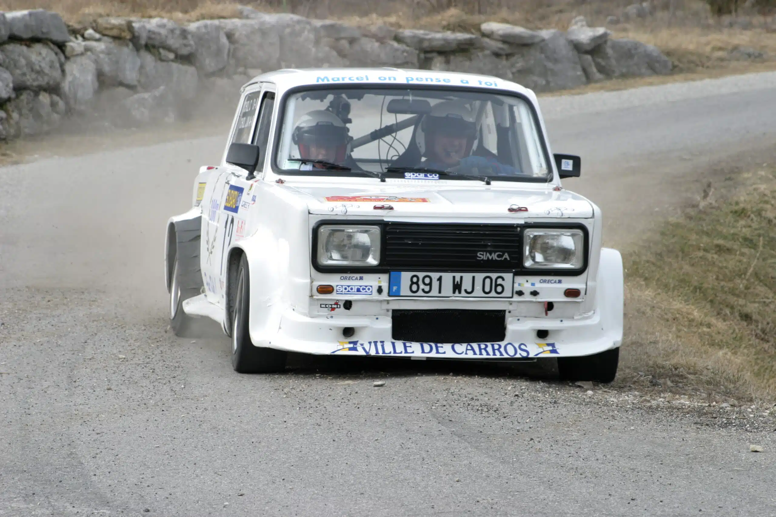 Jean Michel Chol : Je n’ai pas toujours couru qu’avec elle, j’ai couru aussi sur un GT Turbo, une 205 GTi et une BMW, mais pour en revenir à la Simca au départ en 1978 c’était la voiture à la mode, une voiture compétitive et peu chère. Puis j’en suis tombé amoureux et j’ai eu des résultats intéressants avec. C’est vraiment une voiture pas chère à faire rouler. Je dis souvent avec les voitures modernes c’est un rallye avec 8 pneus moi c’est 4 pneus pour 8 rallyes. Alors certes la voiture est plus joueuse mais elle supporte assez bien les vieux pneus. Puis enfin je n’ai pas les moyens de louer une voiture et le budget de la saison serait dépensé pour un seul rallye et la saison finie. Enfin, passer à une autre voiture je ne sais même pas si j’irai aussi vite, la Simca j’y suis bien dedans.