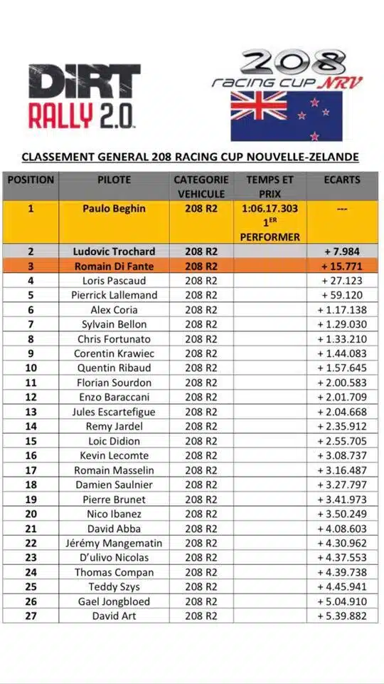 Nicolas Ibanez : L’avantage de l’application de jeu en réseau Racenet de codemaster est de pouvoir jouer au jeu sur toutes les plateformes que ce soit PC, PlayStation4, XboxOne ou même VR. Le jeu est donc le dernier Dirt Rallye 2.0 de chez Codemaster c’est un mélange de rallye avec des épreuves sur terre et asphalte mais aussi du Rally- Cross. Dans ce jeu il y a multitude de catégories de voiture en passant par les voitures modernes telles que les R5 mais aussi des autos plus anciennes comme les groupe B les groupe A d’époque. Cela permet de créer des événements différents et de varier si je puis dire. Bref pour conclure ce confinement permet au club Rallye NRV d’avoir du succès mais je compte bien après ces événements difficiles continuer de faire prospérer et améliorer les événements et l’attractivité de mon club.