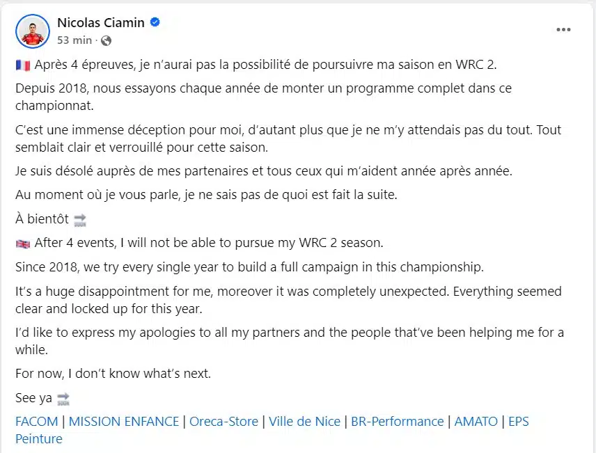 « Après 4 épreuves, je n’aurai pas la possibilité de poursuivre ma saison en WRC 2. Depuis 2018, nous essayons chaque année de monter un programme complet dans ce championnat. C’est une immense déception pour moi, d’autant plus que je ne m’y attendais pas du tout. Tout semblait clair et verrouillé pour cette saison. Je suis désolé auprès de mes partenaires et tous ceux qui m’aident année après année. Au moment où je vous parle, je ne sais pas de quoi est fait la suite. À bientôt. » a commenté Nicolas Ciamin
