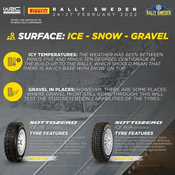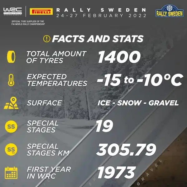 Le Rallye de Suède est la seule manche purement hivernale de la saison sur glace et neige, avec des températures comprises entre moins cinq et moins 10 degrés centigrades la semaine précédant le rallye. Cela signifie qu’il y aura de la glace pleine sur les étapes, mais à certains endroits, il pourrait également y avoir des plaques de gravier. Les pneus spécifiques pour la Suède sont cruciaux dans les conditions hivernales, grâce à la conception cloutée spéciale qui mord dans la surface glissante pour offrir aux conducteurs des niveaux d’adhérence remarquables.
