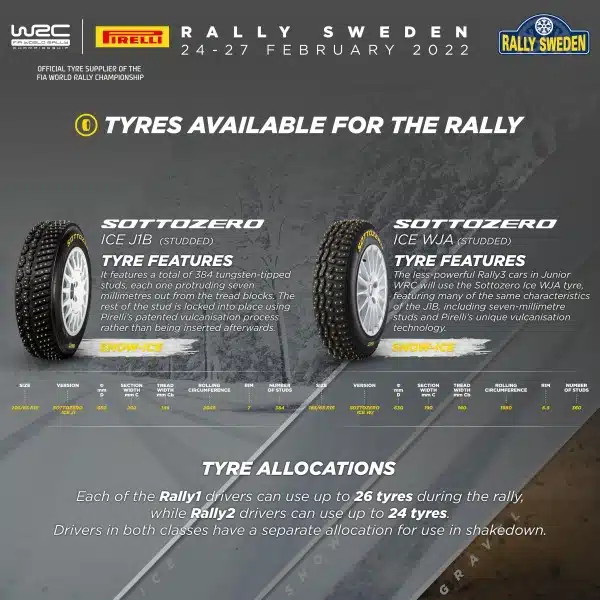 Pirelli apportera environ 1400 pneus en Suède, dont 1200 seront des pneus Sottozero Ice J1B pour la catégorie supérieure des voitures Rally1 et les voitures secondaires Rally2, qui incluent celles enregistrées pour les honneurs WRC2.