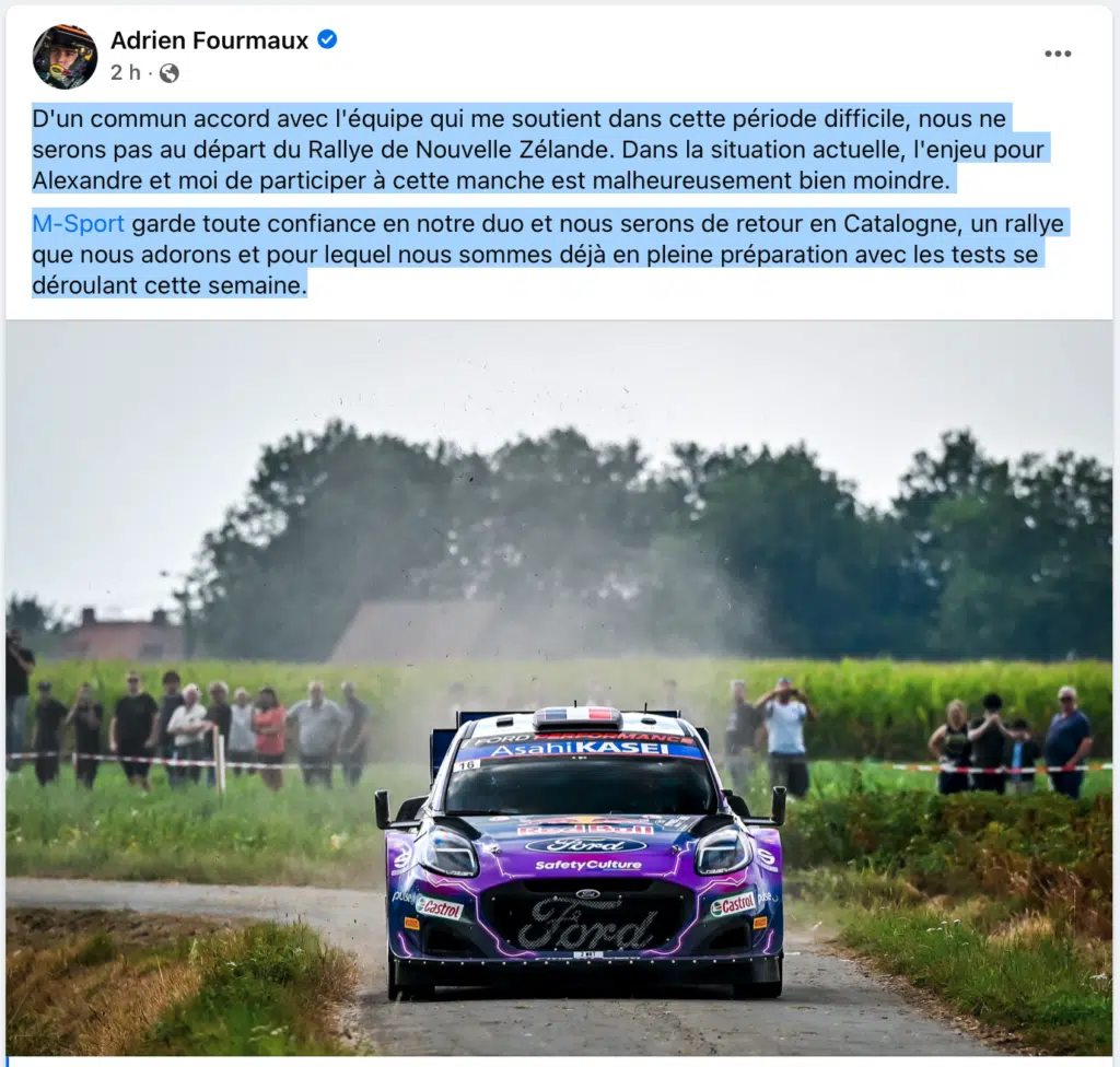 « D’un commun accord avec l’équipe qui me soutient dans cette période difficile, nous ne serons pas au départ du Rallye de Nouvelle Zélande. Dans la situation actuelle, l’enjeu pour Alexandre et moi de participer à cette manche est malheureusement bien moindre. M-Sport garde toute confiance en notre duo et nous serons de retour en Catalogne, un rallye que nous adorons et pour lequel nous sommes déjà en pleine préparation avec les tests se déroulant cette semaine. » a annoncé Arien Fourmaux
