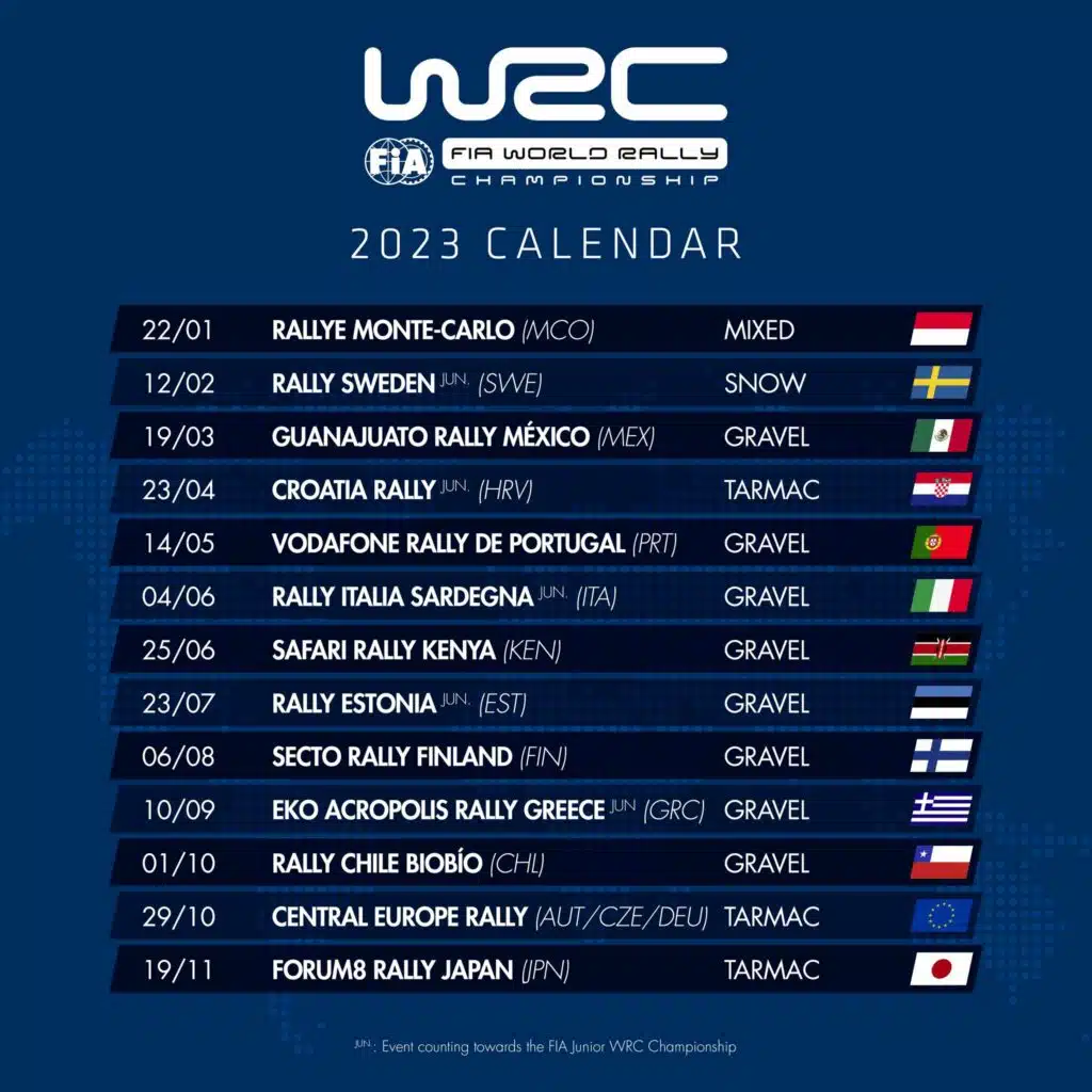 Ca y est le calendrier du Championnat du Monde des rallyes (WRC) vient de sortir avec au programme 13 épreuves. Cela commencera par le traditionnel Monte Carlo du 19-22 Janvier 2023 avant de se terminer du coté du Japon du 16 au 19 Novembre 2023.