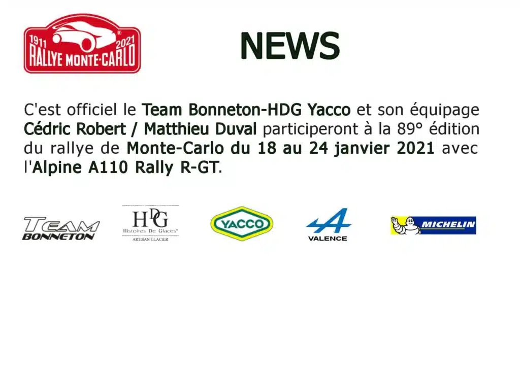 Cédric nous l’avait laissé entendre il y a quelques jours mais c’est maintenant officiel, il sera au départ du Monté Carlo 2021 en compagnie de Matthieu Duval sur l’Alpine du Team Bonneton HDG !