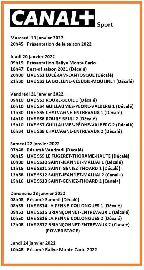 Canal + retransmettra le WRC jusqu’en 2030 et la chaîne vient d’annoncer un dispositif exceptionnel pour la première manche mondiale du WRC 2022 qui se déroulera du 20 au 23 Janvier. Effectivement, ce seront les 17 spéciales qui seront retransmises en direct sur les chaines du Groupe. Le programme ainsi que les chaines qui retransmettront les direct ne sont pas encore dévoilées.