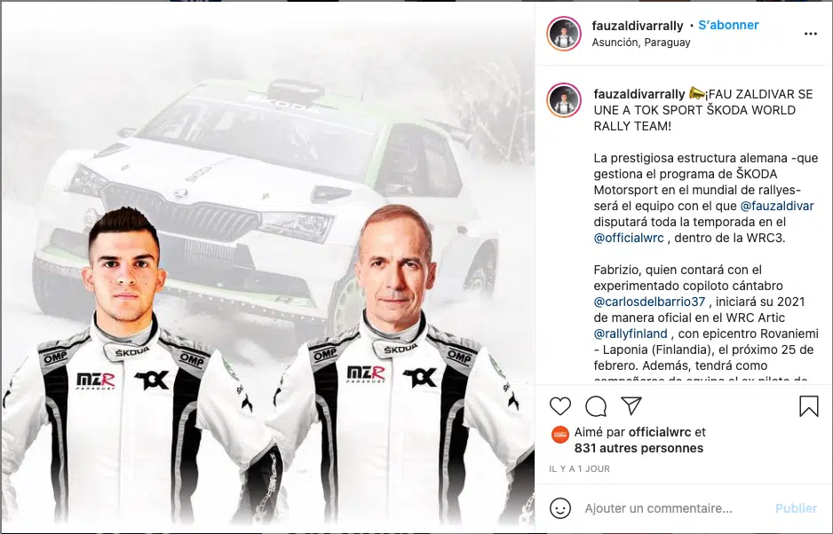 Le pilote paraguayen Fabrizio Zaldívar a confirmé hier après-midi son arrivée dans structure allemande Tok Sport Skoda (qui gère le programme Skoda Motorsport dans le championnat du monde des rallyes) avec laquelle il concourra tout au long de la saison WRC3 avec son nouveau copilote Carlos del Barrio à bord d’une Skoda Fabia Rally2.