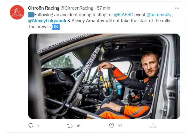 Mise à jour 15 h 27 : Ca y est la nouvelle vient de tomber par l’intermédiaire de Citroën Sport et après sa grosse sortie, Alexey Lukyanuk est bel et bien forfait pour le Barum Rally, c’est un nouveau gros coup dur pour le pilote qui enchaîne les sorties cette saison et comptablement c’est pas une bonne affaire non plus.