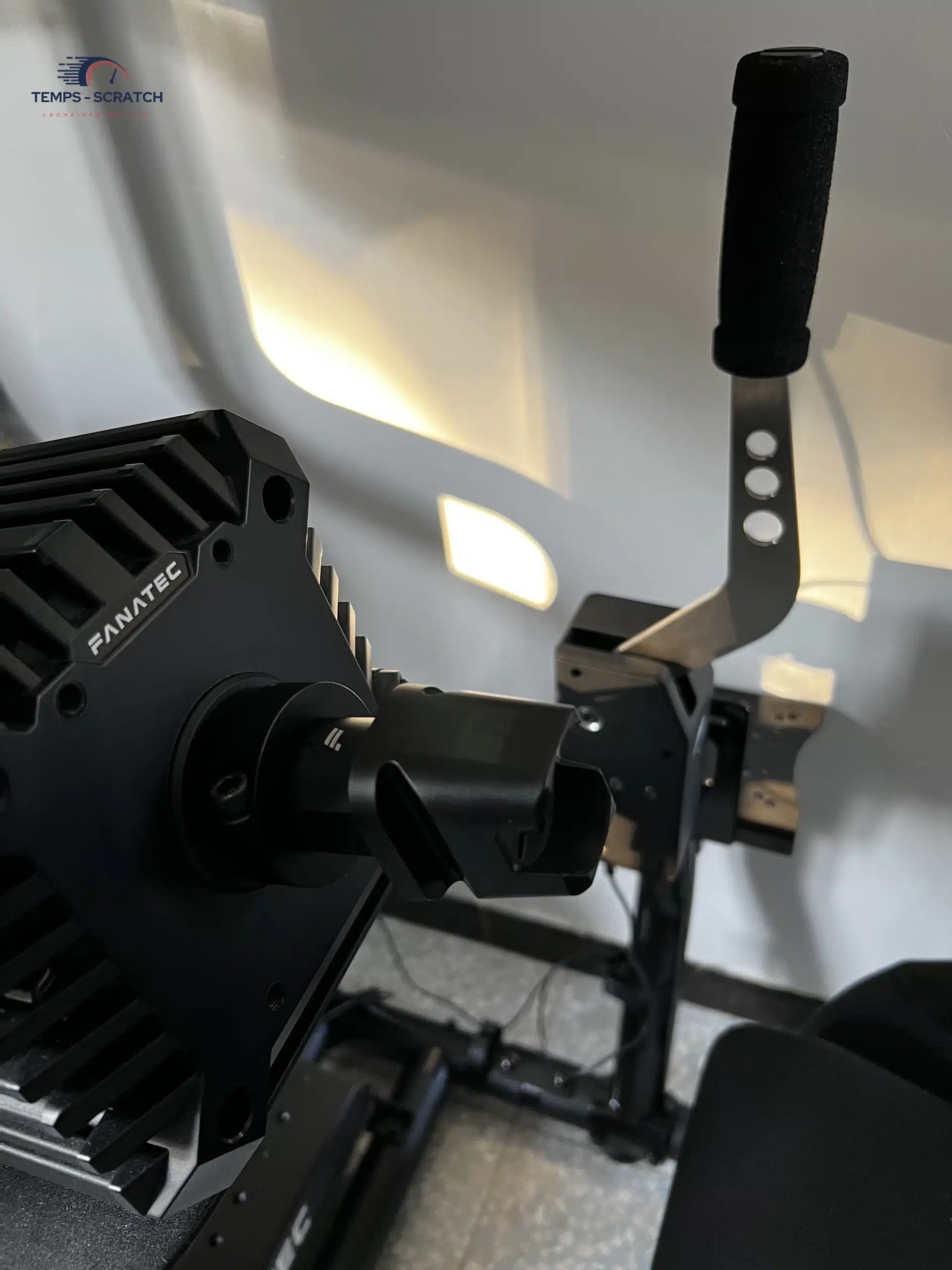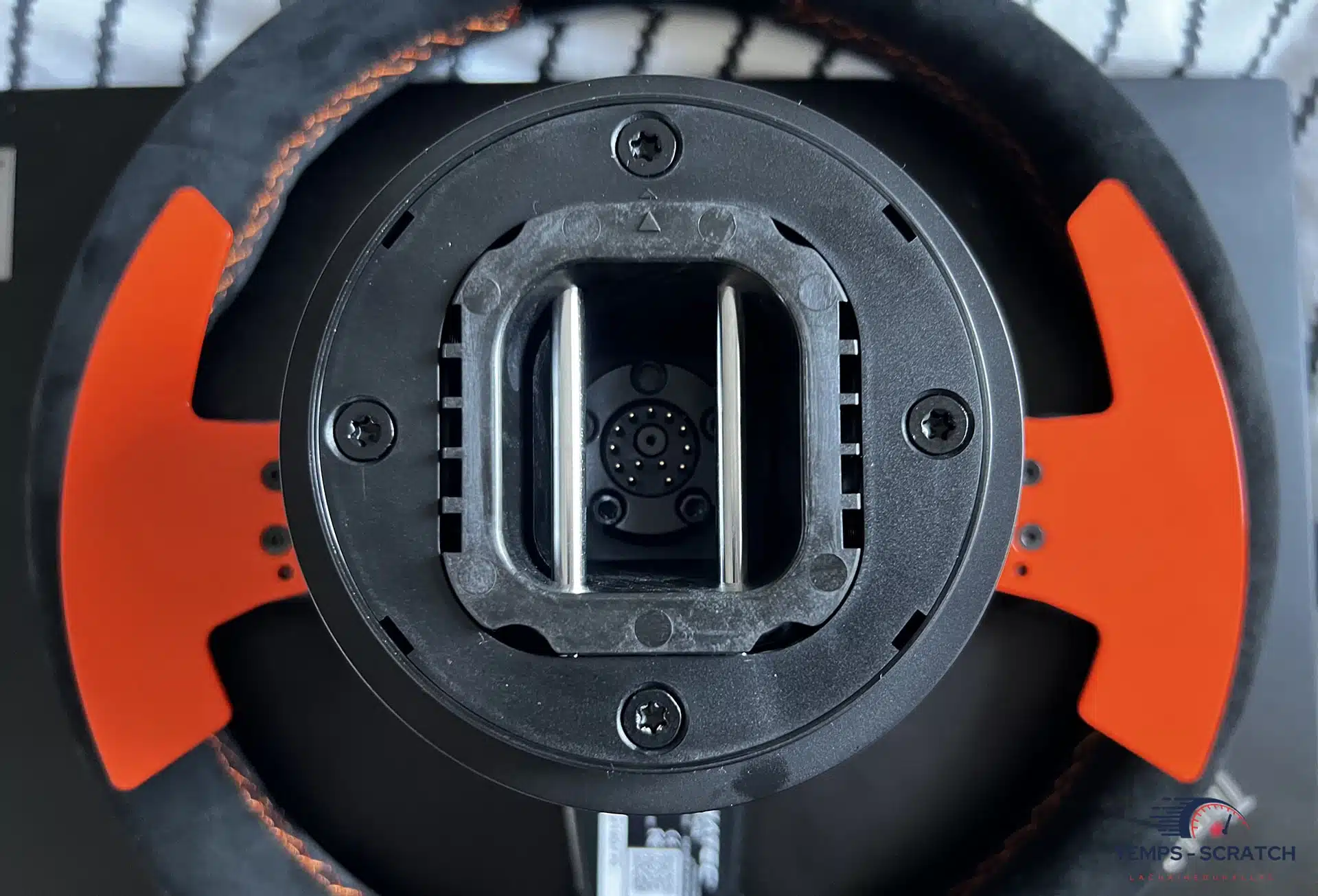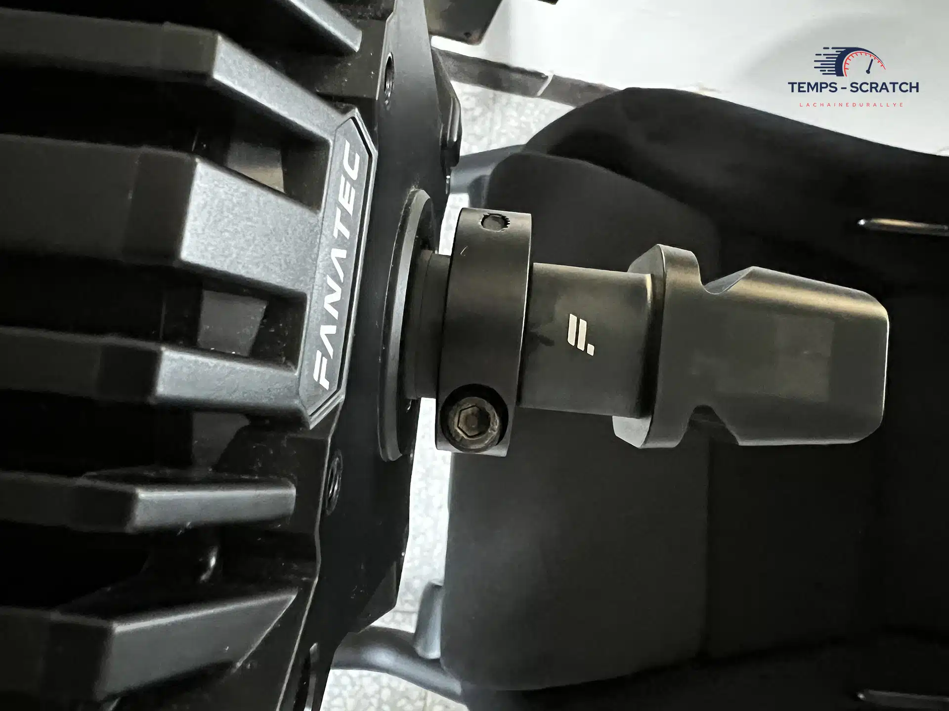 Fini la bague qu’on tourne c’est un verouillage comme sur les voiture de courses avec deux tiges qui viennent se positionner sur la base du QR2. Alors est – ce qu’il y a du jeu comme sur le QR1 ? Et bien non c’est verrouillé ça ne bouge plus et le volant n’a plus de jeu. Le seul jeu qui est très léger c’est celui du support de mon cockpit et encore il faut y aller comme un bourrin pour que cela bouge. Il faut par contre s’habituer lorsque l’on met ou lorsque l’on sort le volant avec ce nouveau QR2, il faut tirer sur la bague et soit pousser pour insérer ou alors tirer vers soit pour l’enlever et c’est un peu dur, ça sent que c’est vraiment verrouillé. Mais c’est plus simple et plus rapide pour mettre ou enlever le volant.