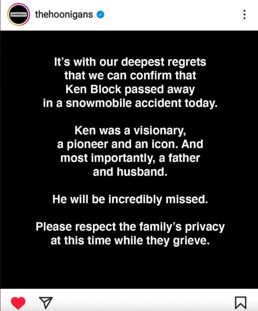 « C’est avec nos plus profonds regrets que nous pouvons confirmer que Ken Block est décédé dans un accident de motoneige aujourd’hui. Ken était un visionnaire, un pionnier et une icône. Et, plus important encore, un père et un mari. Il nous manquera énormément. Veuillez respecter la vie privée de la famille en ce moment pendant qu’ils sont en deuil. »