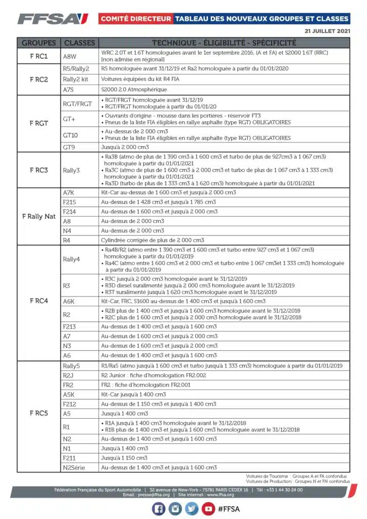 Le comité Directeur de la FFSA vient de refondre les groupes et les classes, il a été entériné une refonte des Groupes et Classes dans les Rallyes FFSA en harmonie avec les nouvelles appellations FIA.