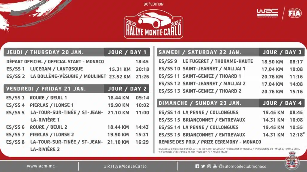 Le Rallye Automobile Monte-Carlo, manche inaugurale du Championnat du Monde FIA des Rallyes 2022 (WRC) quitte provisoirement Gap – Ville étape Haut-Alpine depuis 2014 pour prendre exceptionnellement ses quartiers d’hiver à Monaco avec 15 spéciales au programme et quatre jours de courses pour un départ le Jeudi 2à Janvier et une arrivée le Dimanche 23.