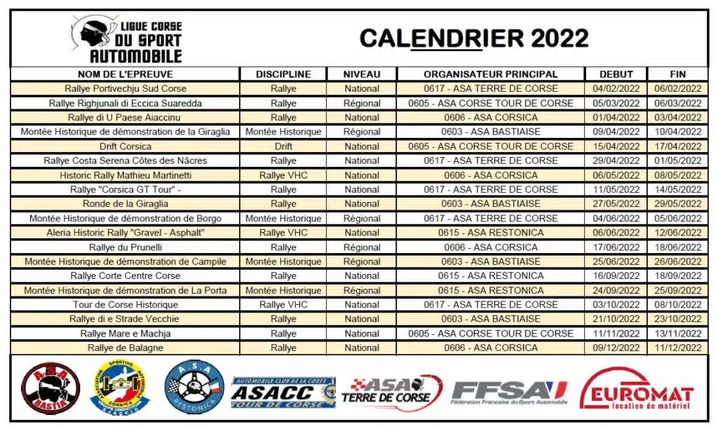 La Ligue Corse du Sport Automobile vient de publier le prochain calendrier Corse 2022 et la saison démarrera début Février avec le Rallye Portivechju Sud Corse (04/02 – 06/02) pour se fermer avec le traditionnel Rallye de Balagne début Décembre (09/12 – 11/12) et ce seront 19 épreuves au total avec les épreuves historiques comprises.