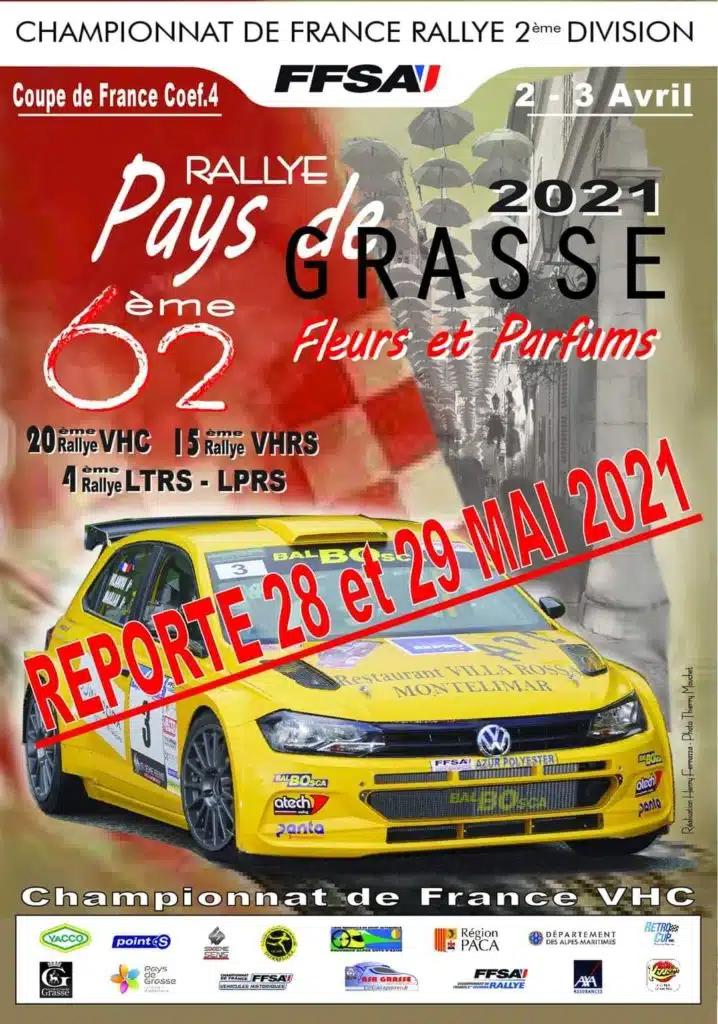 Bonjour a tous, toute l équipe de l ASA Grasse a tout tenté mais a le regret de vous informer de son incapacité d organiser le rallye de Grasse les 2 et 3 avril, dans de bonnes conditions, compte tenu des contraintes liées a la situation sanitaire et du fait que le ministère des sports autorise que les rallyes du championnat de France de 1ere division.L e comité d organisation a donc pris la décision de reporter le rallye au 28 et 29 Mai.