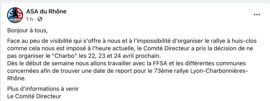 Bonjour à tous, Face au peu de visibilité qui s’offre à nous et à l’impossibilité d’organiser le rallye à huis-clos comme cela nous est imposé à l’heure actuelle, le Comité Directeur a pris la décision de ne pas organiser le « Charbo » les 22, 23 et 24 avril prochain.Dès le début de semaine nous allons travailler avec la FFSA et les différentes communes concernées afin de trouver une date de report pour le 73ème rallye Lyon-Charbonnières-Rhône.Plus d’informations à venir