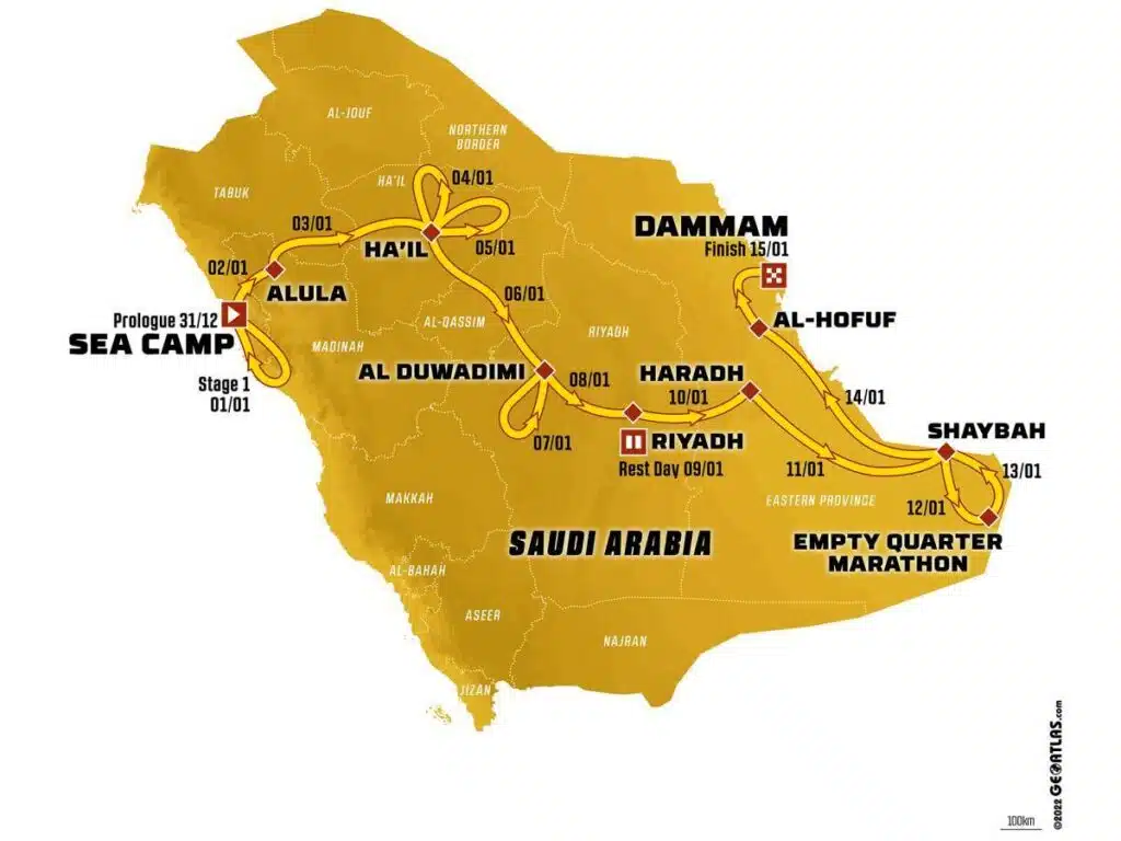 Ca y est le parcours du Dakar 2023 est connu avec un départ dès le 31 Décembre 2022 dans un Sea Camp en bord de Mer Rouge, une arrivée sur la façade opposée où les concurrents découvriront les rivages du golfe Arabique, après avoir vécu un séjour de quatre jours dans l’Empty Quarter, où sera disputée une étape marathon : la 45e édition du Dakar offre le parcours le plus exigeant qui ait été dessiné depuis son accueil en Arabie Saoudite. Avec près de 5 000 kilomètres de spéciale au total répartis sur 14 étapes en plus d’un prologue, le programme s’adresse bel et bien aux experts de l’endurance extrême.