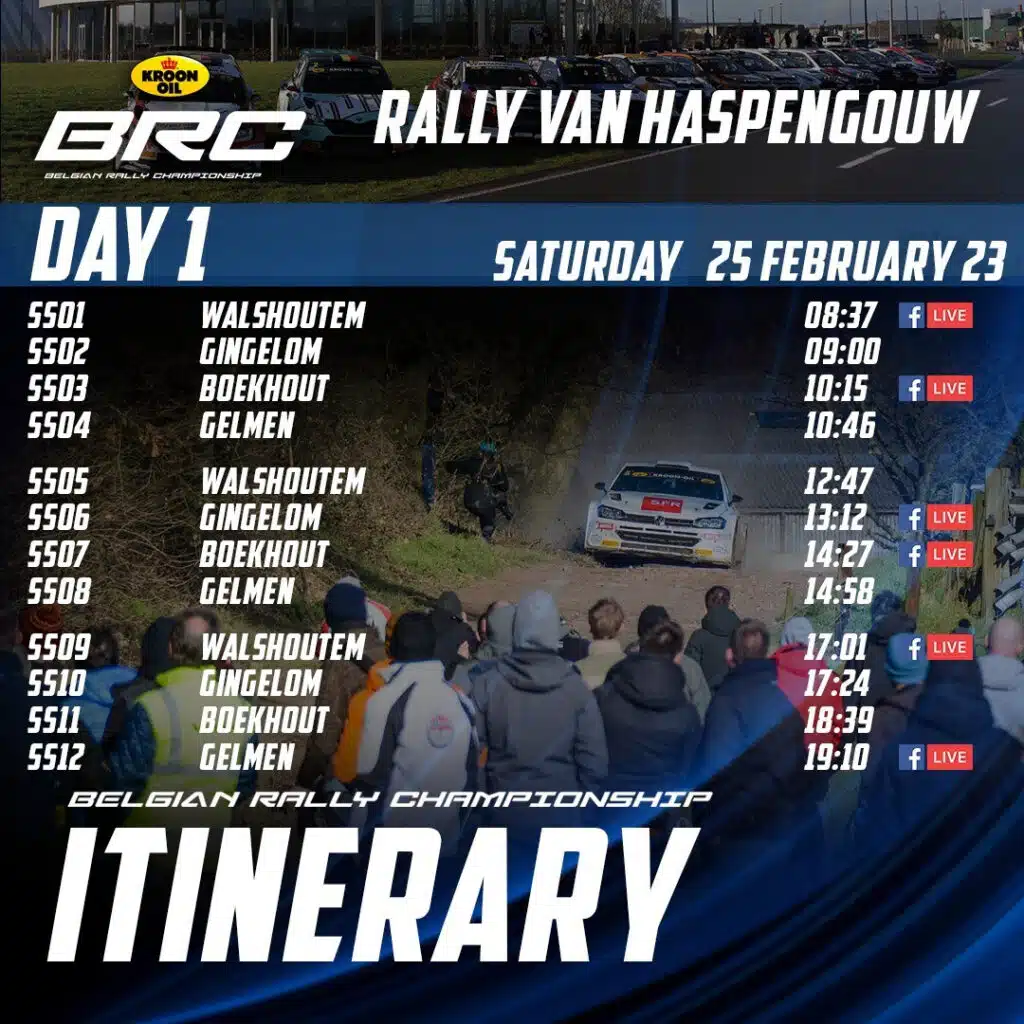 Samedi, trois boucles de 4 spéciales sont au programme. La moitié de ces spéciales pourra être suivie en direct grâce aux BRC Live Shows. Nous débuterons avec l’ES 1, Walshoutem, à 8h30, avant de suivre l’ES 3, Boekhout, à 10h15. En deuxième boucle, nous serons en direct pour assister à l’ES 6 Gingelom, à 13h10, avant de rejoindre l’ES 7, Boekhout, à 14h25. Au cours de la dernière boucle, nous suivrons en direct l’ES 9, Walshoutem, à 17h. Et, naturellement, nous vivrons aussi en direct le dénouement de l’épreuve avec l’ES 12, Gelmen, à 19h05. Qui décrochera la première victoire de la saison ? Vous pourrez le savoir en suivant en direct le dernier BRC Live Show, présenté depuis le BRC Studio, établi au Droneport, le Rally HQ de ce Rally van Haspengouw.
