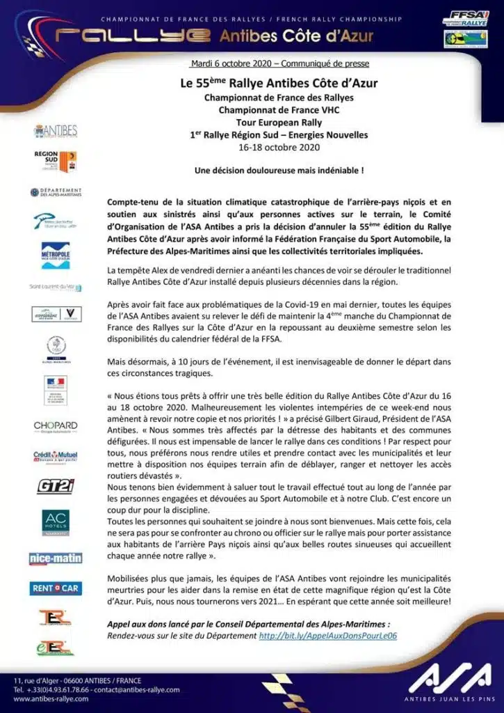 On vous l’annonçait plus tot ce matin, ça y est c’est officiel le 55 ème Rallye d’Antibes n’aura pas lieu cette année, après une premier report du au COVID c’est la nature qui a défiguré l’arrière pays Niçois, aussi il était impensable que le rallye puisse se tenir dans de bonnes conditions.