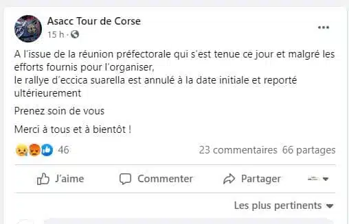 A l’issue de la réunion préfectorale qui s’est tenue ce jour et malgré les efforts fournis pour l’organiser,le rallye d’eccica suarella est annulé à la date initiale et reporté ultérieurement Prenez soin de vous Merci à tous et à bientôt !