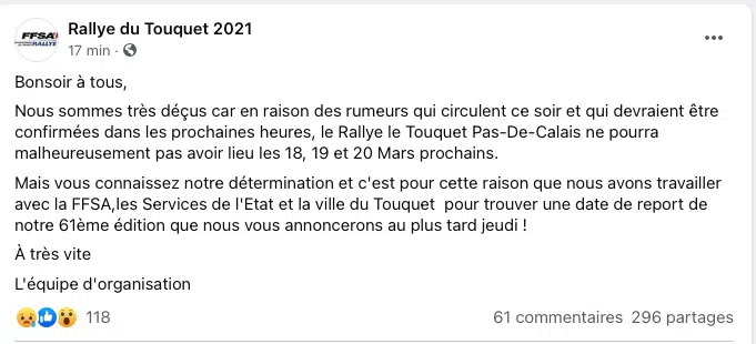 Bonsoir à tous, Nous sommes très déçus car en raison des rumeurs qui circulent ce soir et qui devraient être confirmées dans les prochaines heures, le Rallye le Touquet Pas-De-Calais ne pourra malheureusement pas avoir lieu les 18, 19 et 20 Mars prochains. Mais vous connaissez notre détermination et c’est pour cette raison que nous avons travailler avec la FFSA,les Services de l’Etat et la ville du Touquet pour trouver une date de report de notre 61ème édition que nous vous annoncerons au plus tard jeudi ! À très vite L’équipe d’organisation