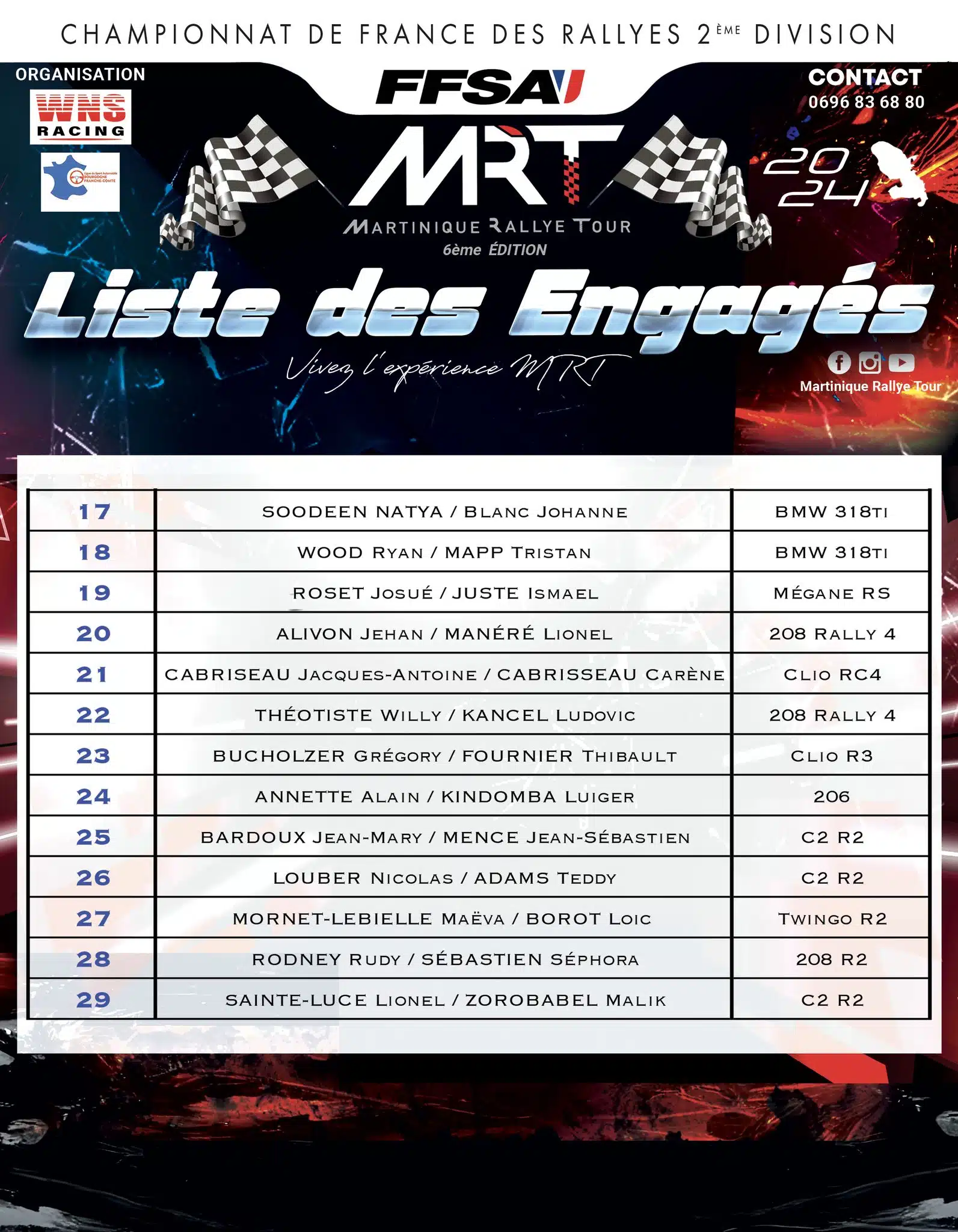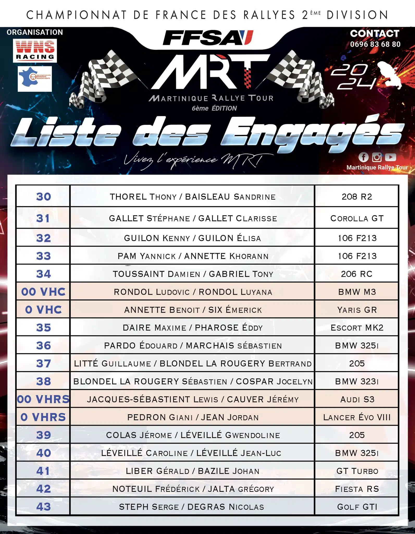 8 ème manche du Championnat de France des Rallyes 2e Division 2024, le Martinique Rallye Tour 2024 sera organisé du 26 au 28 juillet 2024 et la liste des engagés vient de sortir.