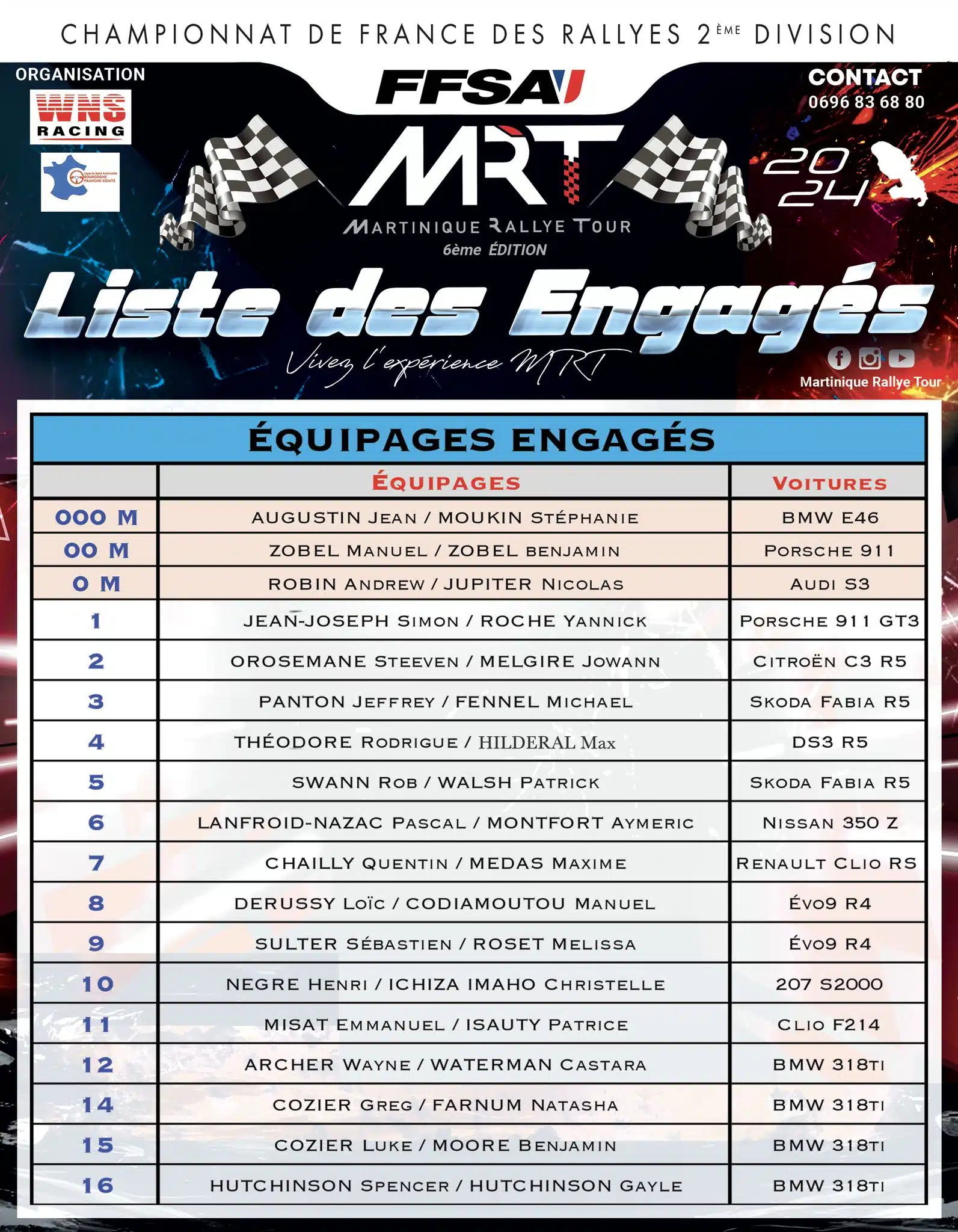 8 ème manche du Championnat de France des Rallyes 2e Division 2024, le Martinique Rallye Tour 2024 sera organisé du 26 au 28 juillet 2024 et la liste des engagés vient de sortir.