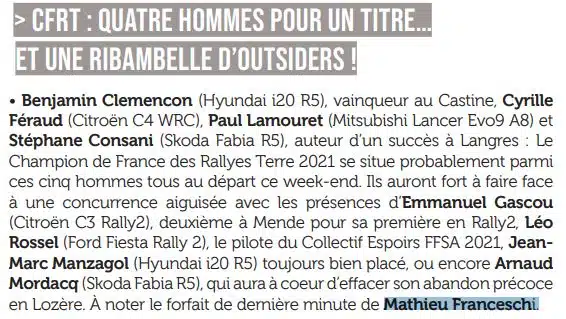 La série continue et c’est un nouveau coup de tonnerre pour Mathieu Franceschi qui est forfait pour le terre des Cardabelles. C’est un communiqué de la FFSA qui nous l’apprend ce matin. Après l’annonce surprise de sa fin de saison en 208 Rally Cup, le jeune espoir Français semble avoir bel et bien des soucis pour boucler et terminer sa saison même sur terre. Quel dommage !