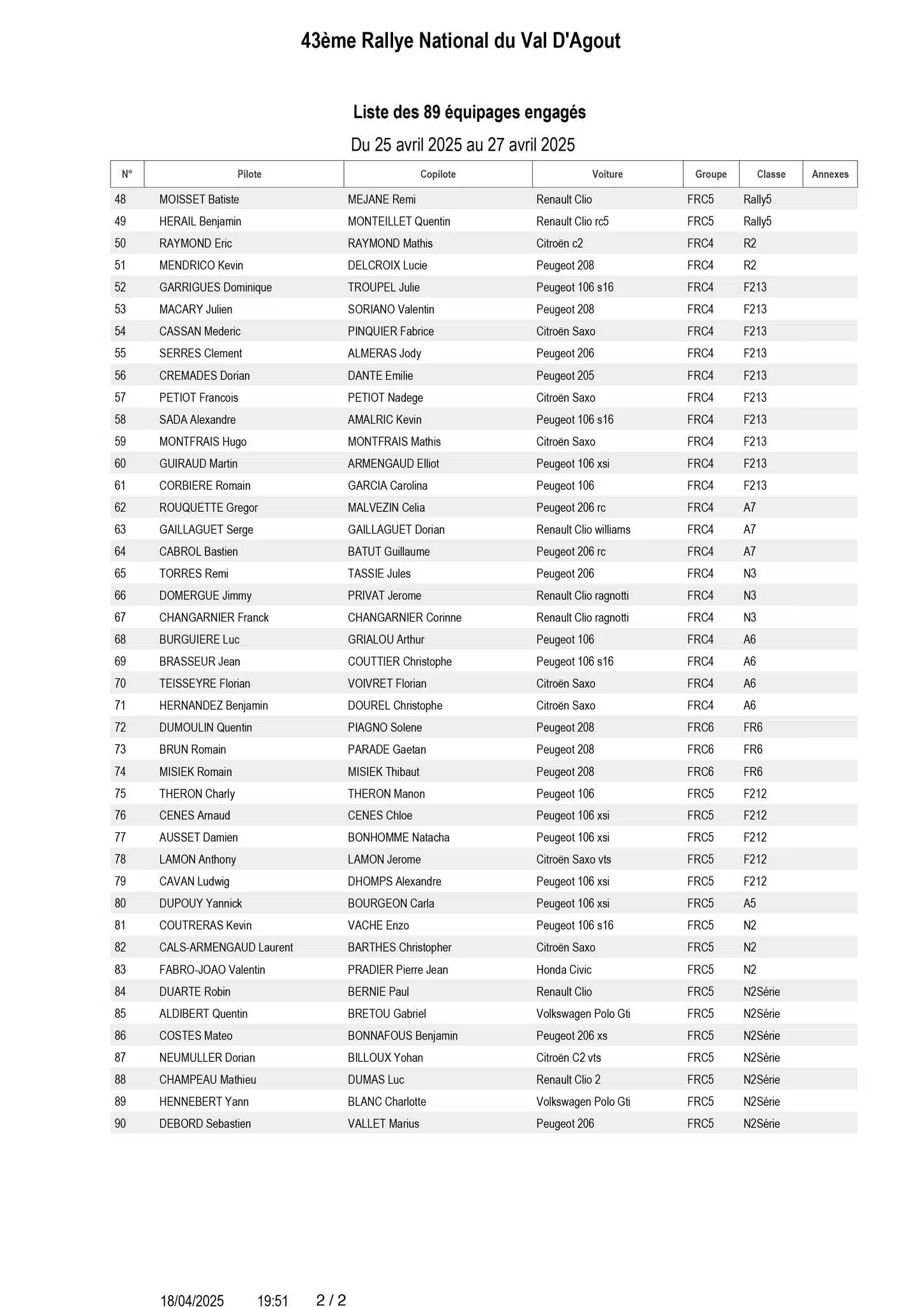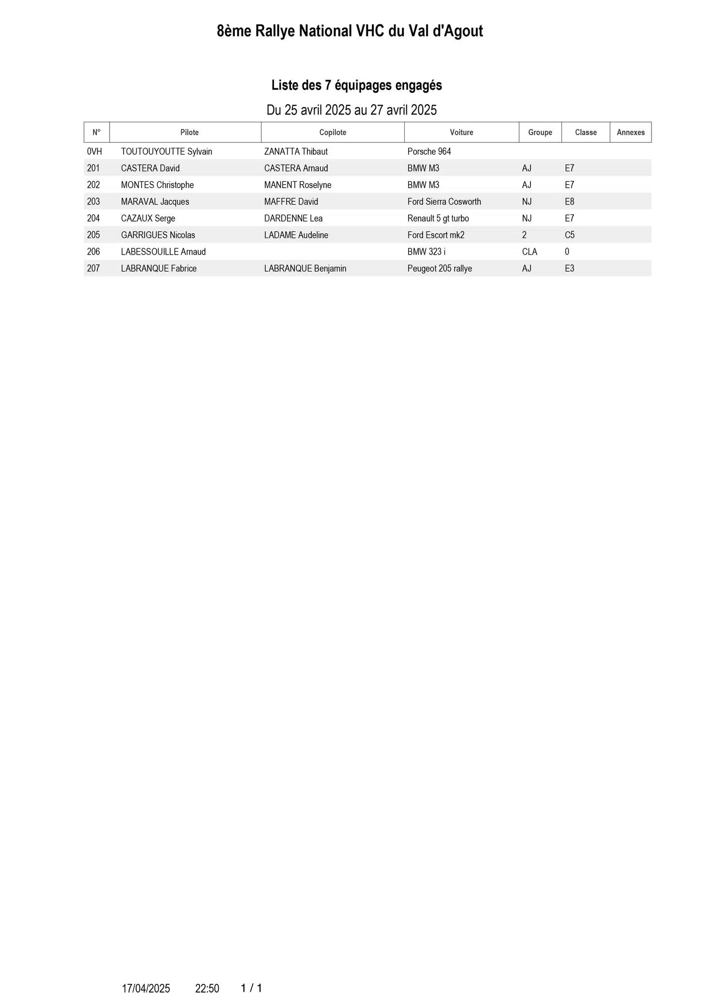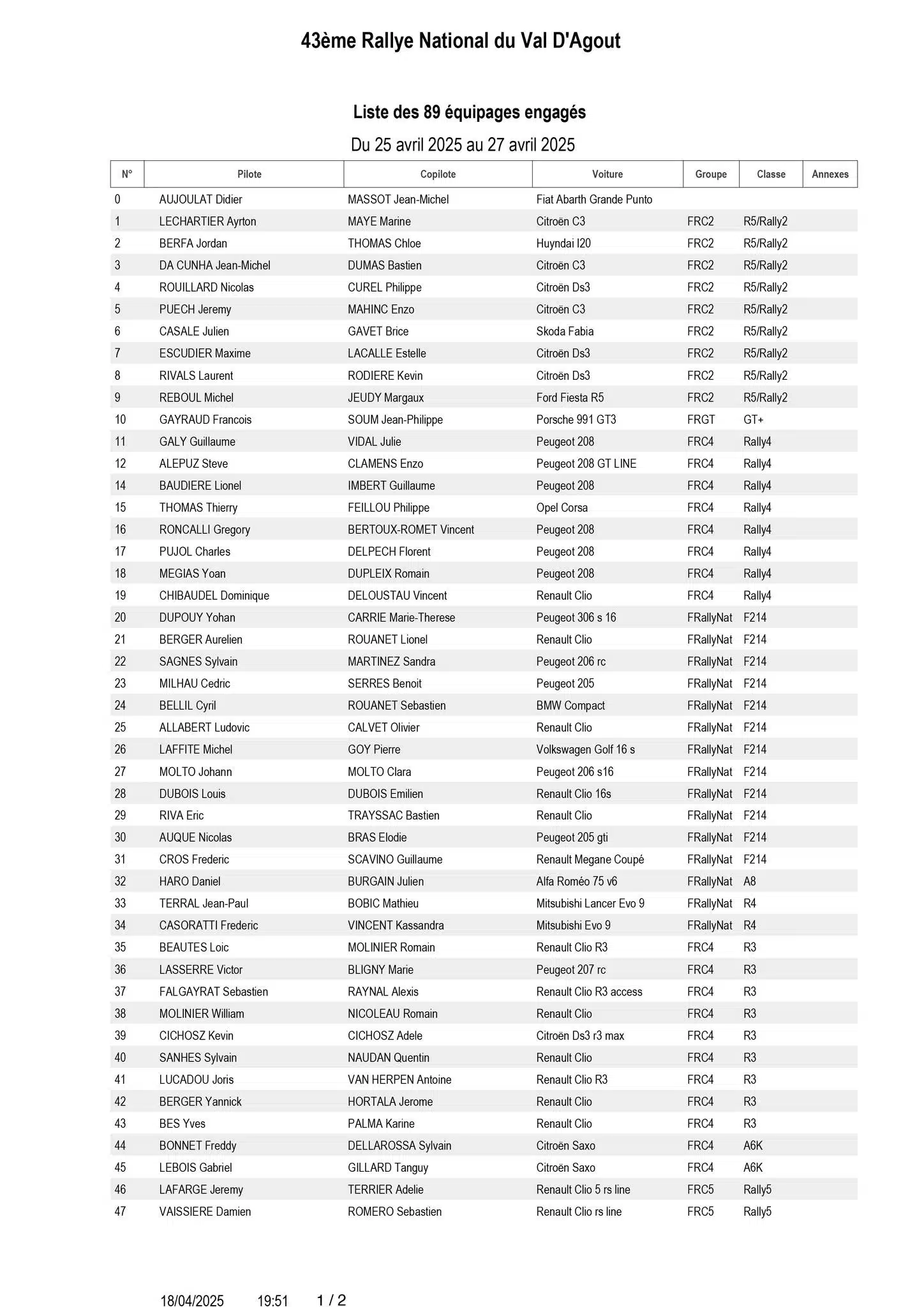 Rallye du Val d’Agout 2025 – Liste des engagés