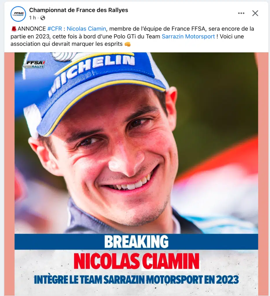 Très bonne nouvelle pour Nicolas Ciamin qui sera encore en Championnat de France des Rallyes toujours associé Yannick Roche qui lui a été révélé par Rallye Jeunes FFSA. Il échange sa Hyundai contre une Polo du Team Sarrazin Motorsport avec un objectif clair qui sera le titre de Champion de France des Rallyes et cela commencera au mois de mars par le Rallye du Touquet.