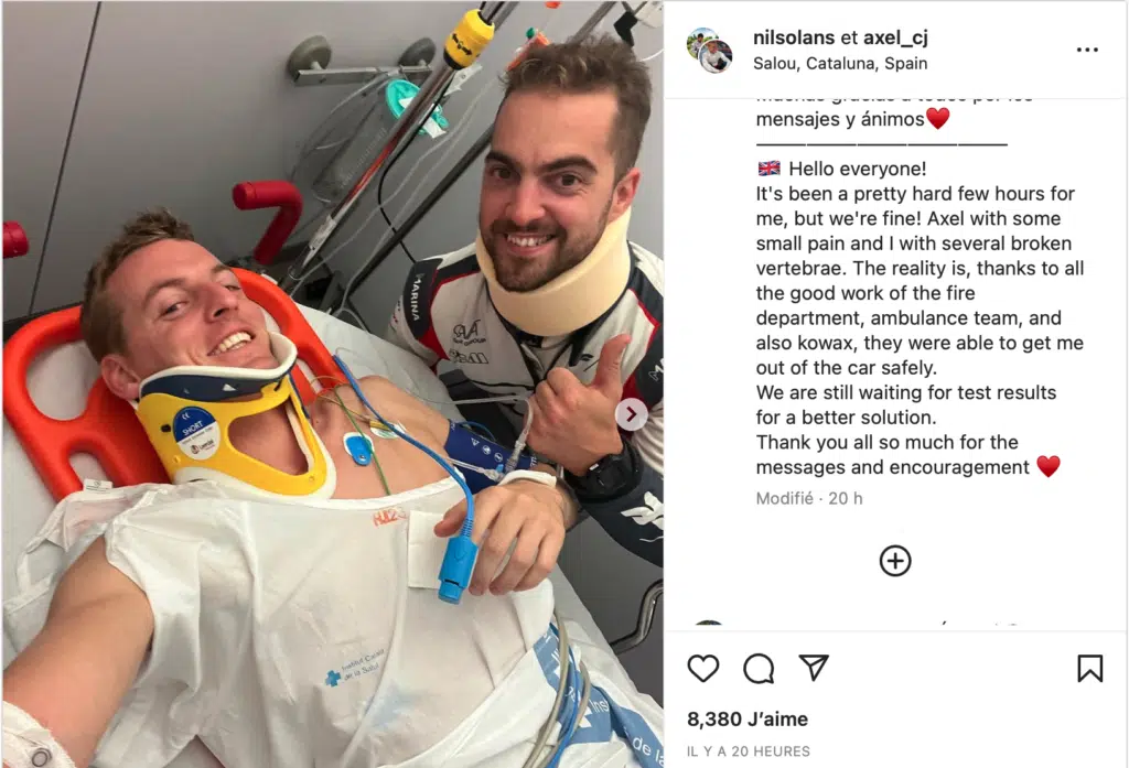 « Bonjour à tous ! Ça a été des heures assez difficiles pour moi, mais ça va ! Axel avec quelques petites douleurs et moi avec plusieurs vertèbres cassées. La réalité est que, grâce à tout le bon travail des pompiers, de l’équipe d’ambulance et aussi de kowax, ils ont pu me sortir de la voiture en toute sécurité. Nous attendons toujours les résultats des tests. Merci à tous pour vos messages et vos encouragements. » a commenté Nil Solans