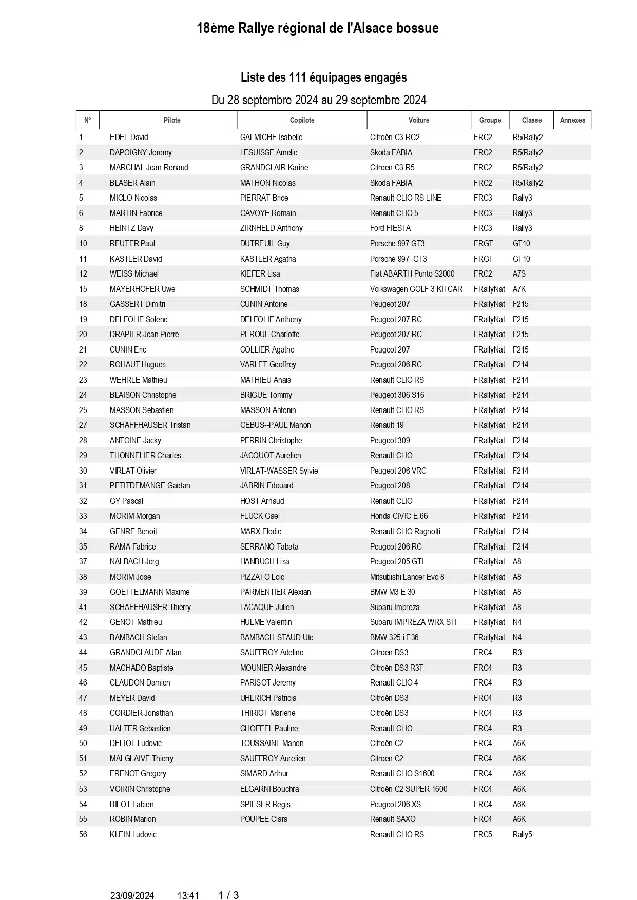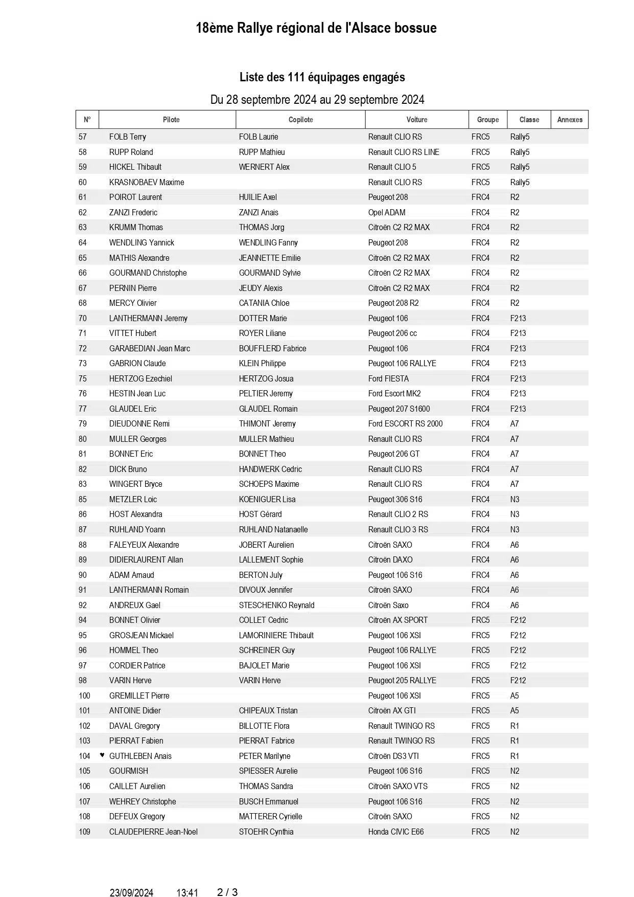Rallye Alsace Bossue 2024 : Liste des engagés