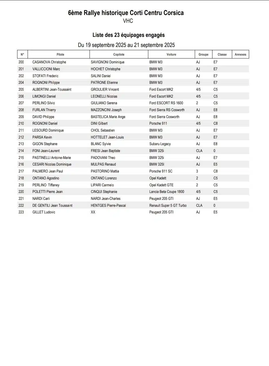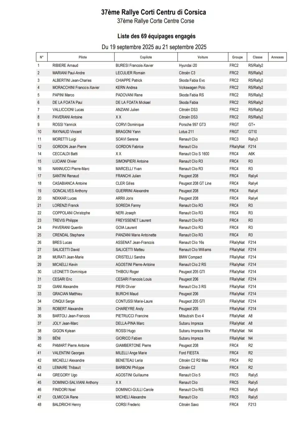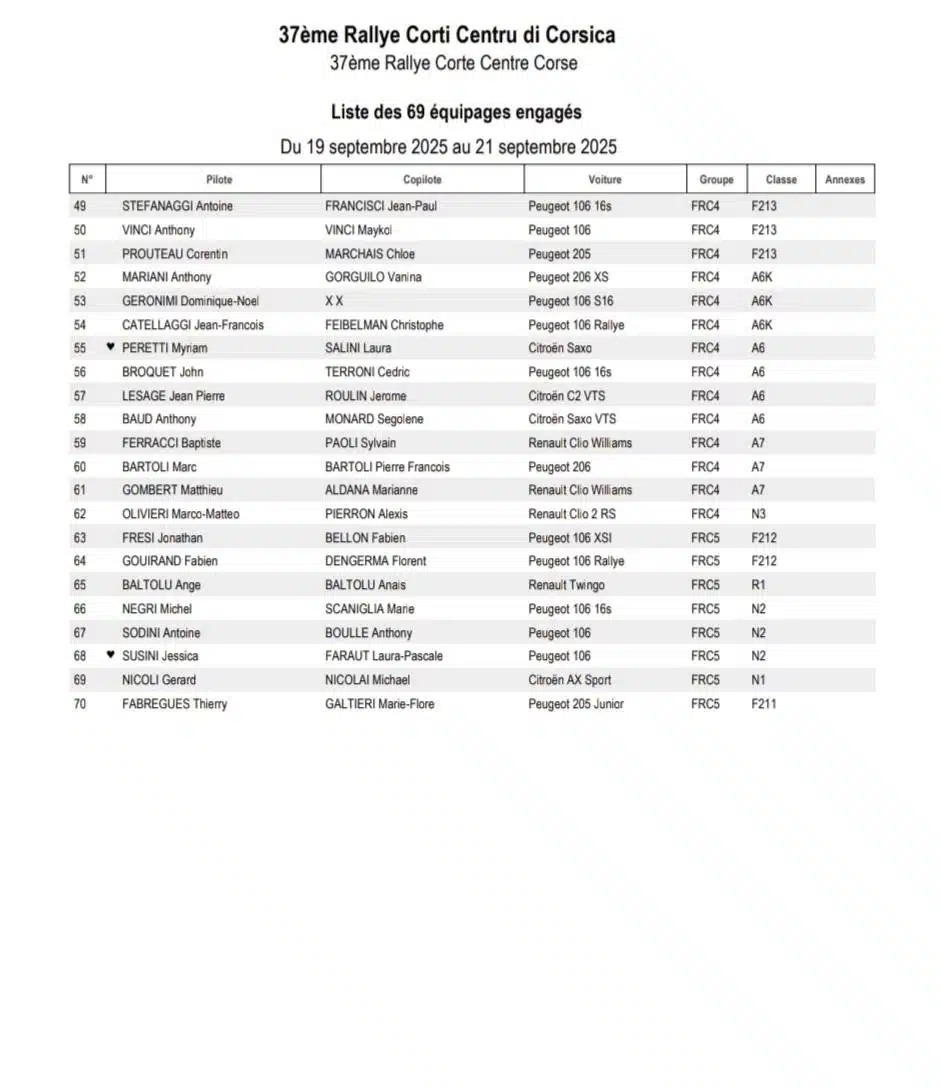 Rallye de Corte Centre-Corse 2025 – Liste des engagés