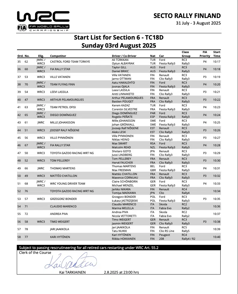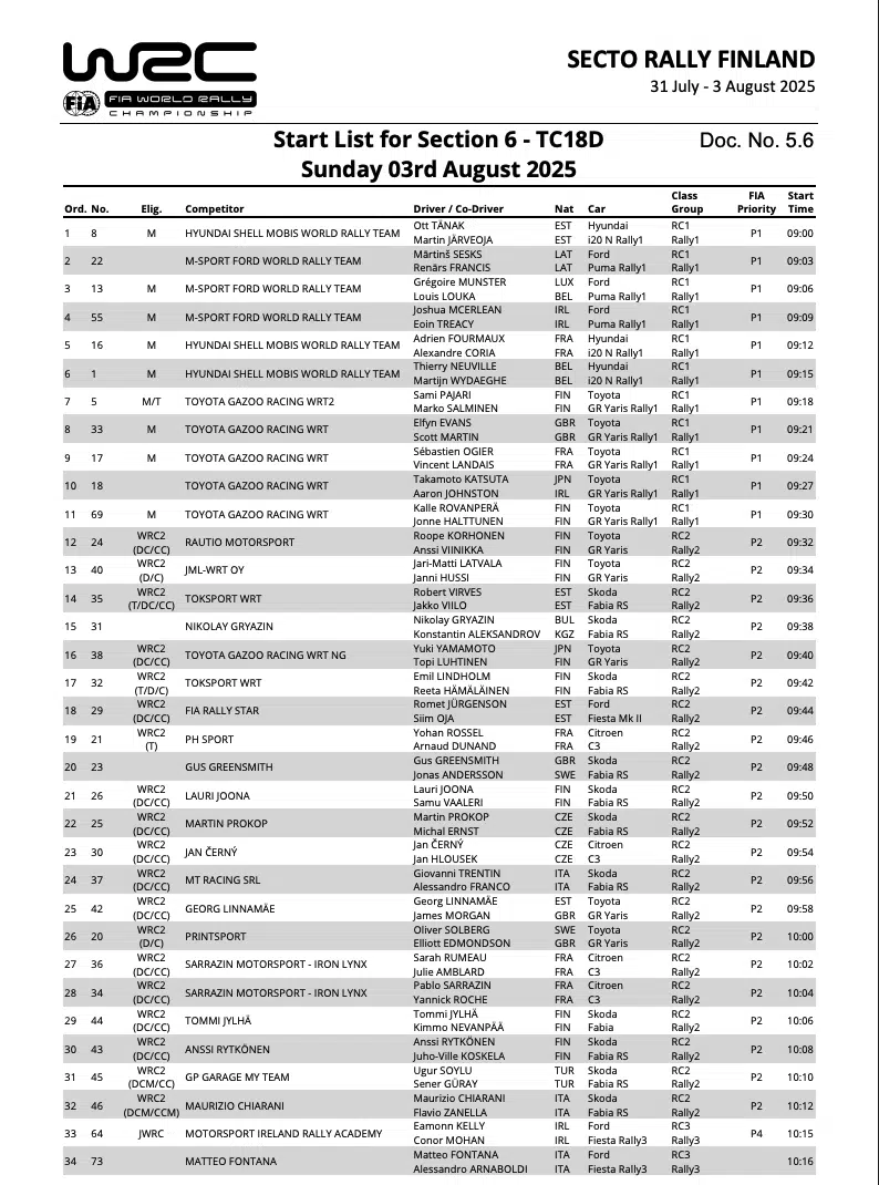 Seulement deux spéciales au programme de ce « Super Sunday » mais alors ce sont deux passages dans la mythique spéciale Ouninpohja à 09 h 35 et 12 h 35 pour la Power Stage et voici la liste de départ de cette dernière journée.