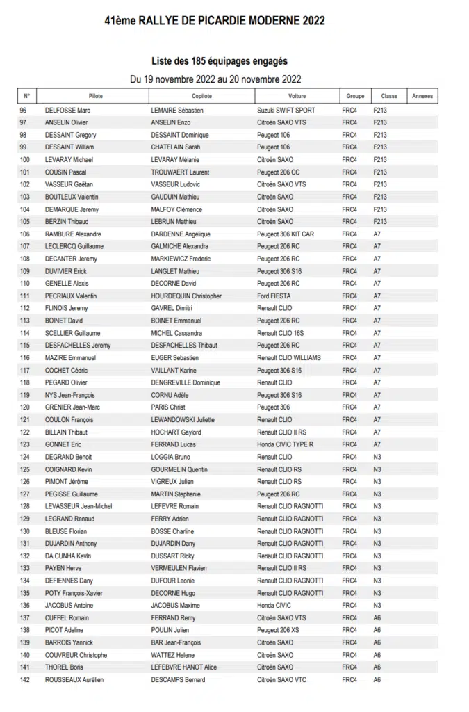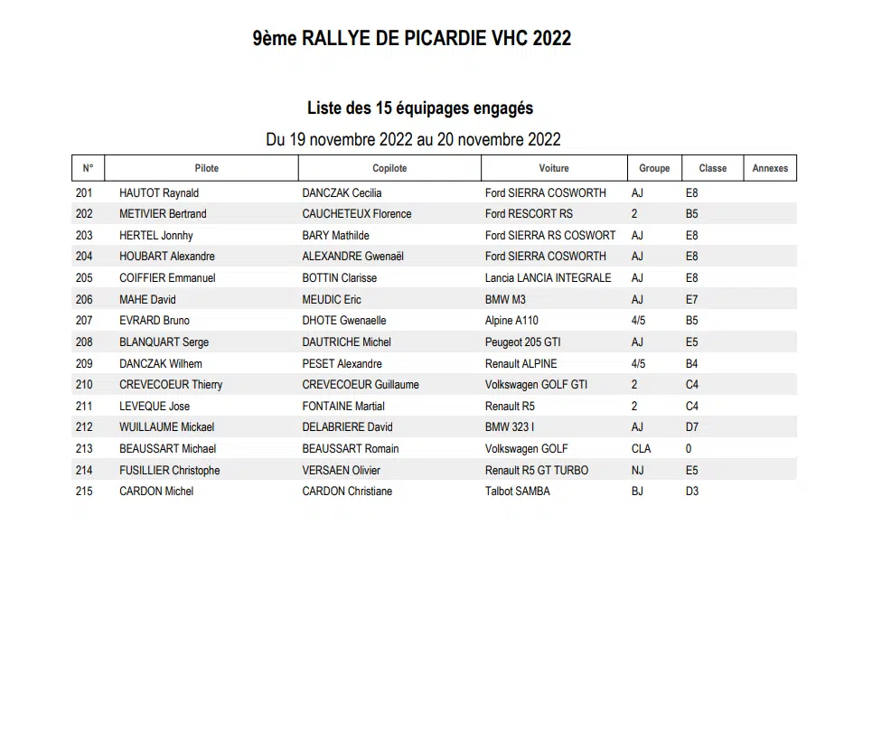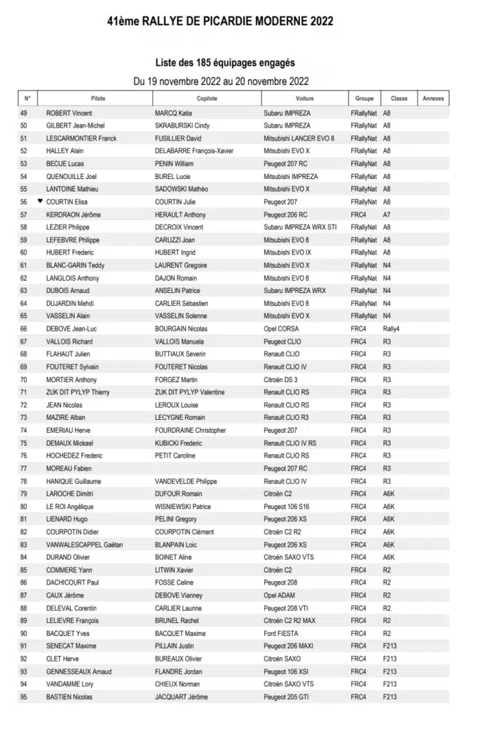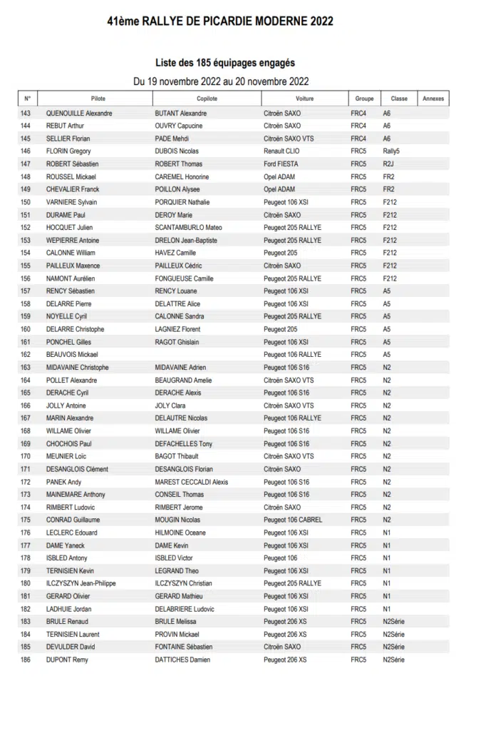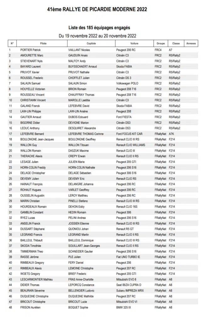 La 41 ème édition du Rallye régional de Picardie sera organisée les 19 et 20 novembre 2022 par l’ASA Picardie avec une magnifique liste d’engagés qui comptera 185 partants en moderne sur les quatre spéciales du parcours prévu.