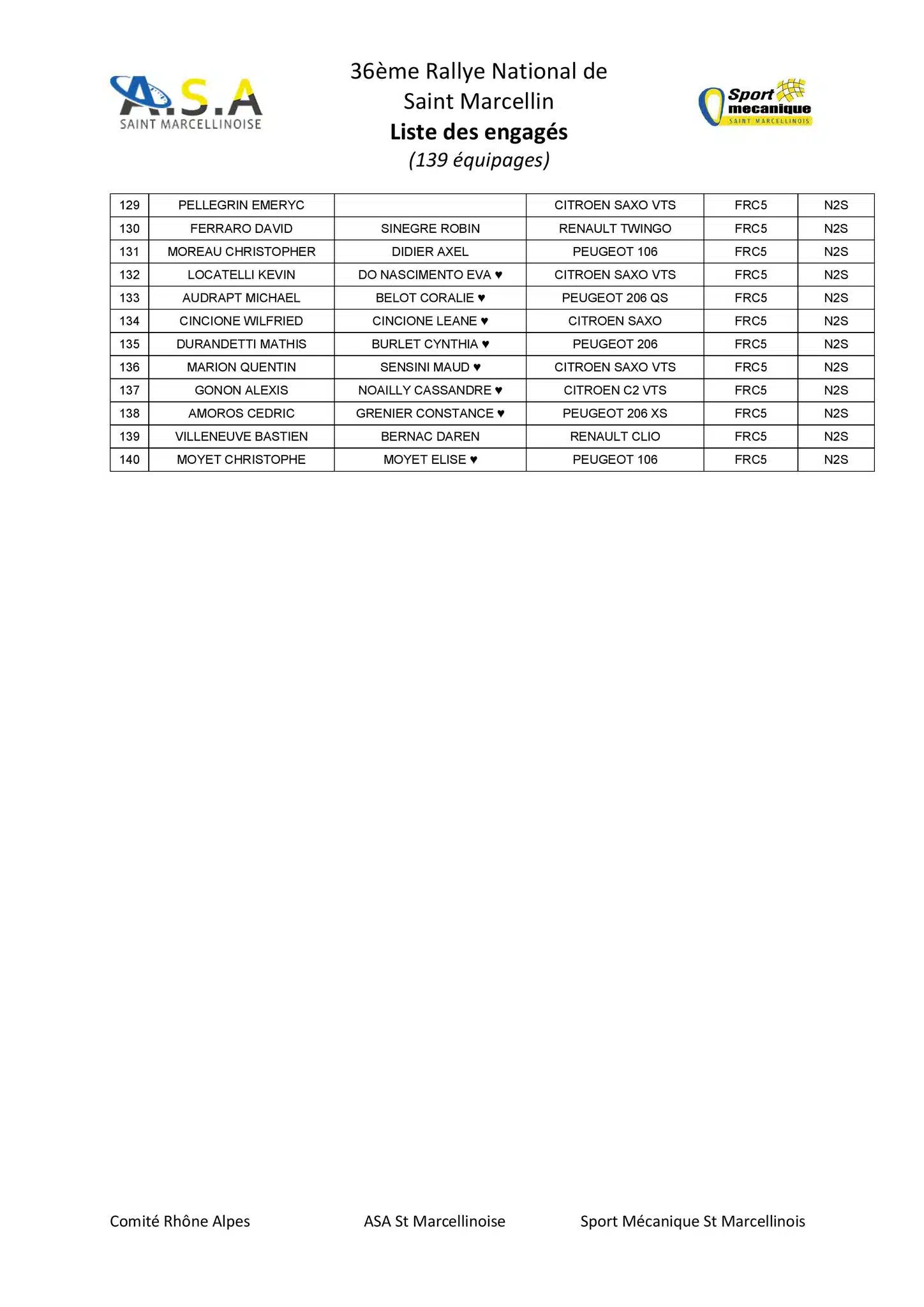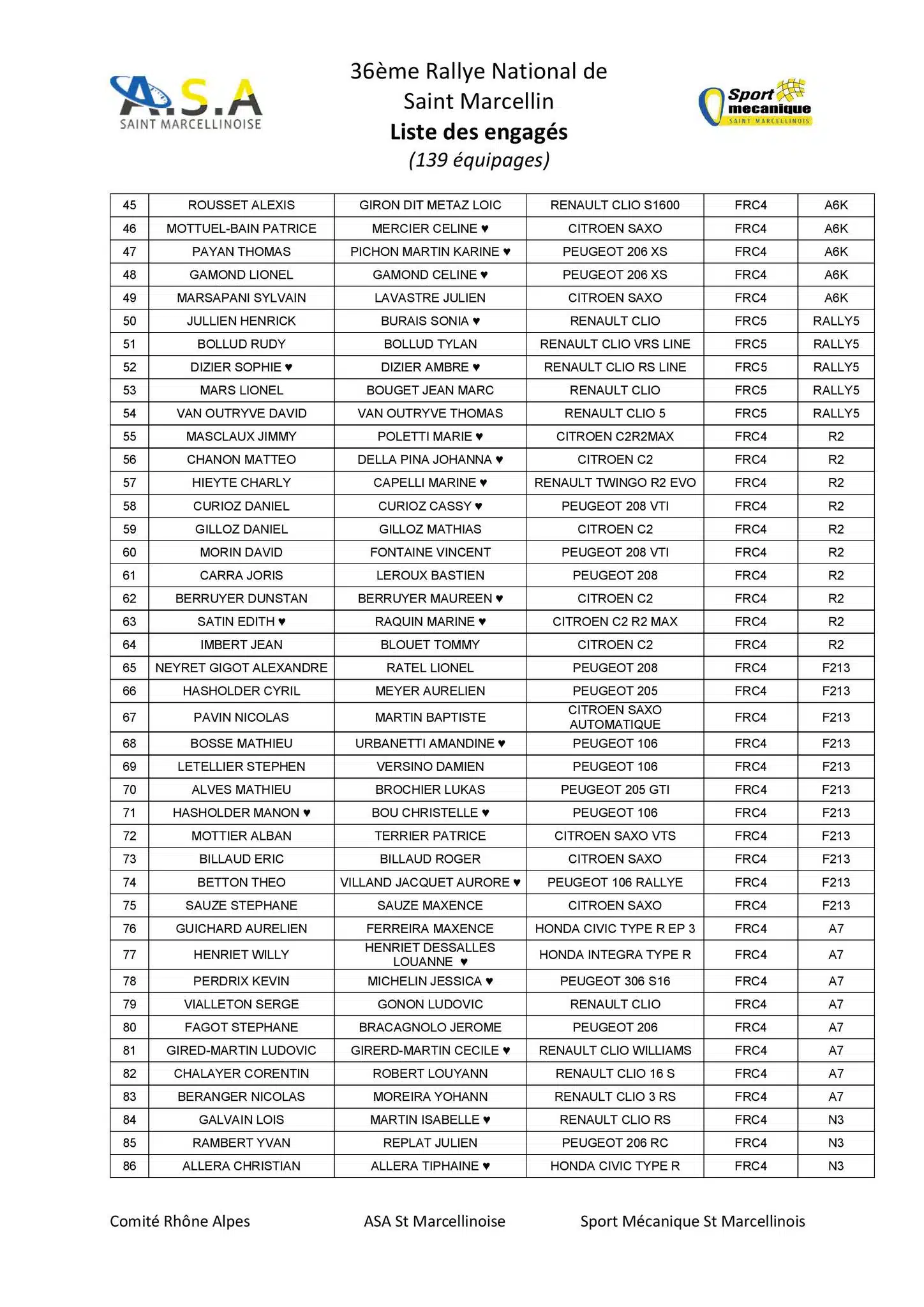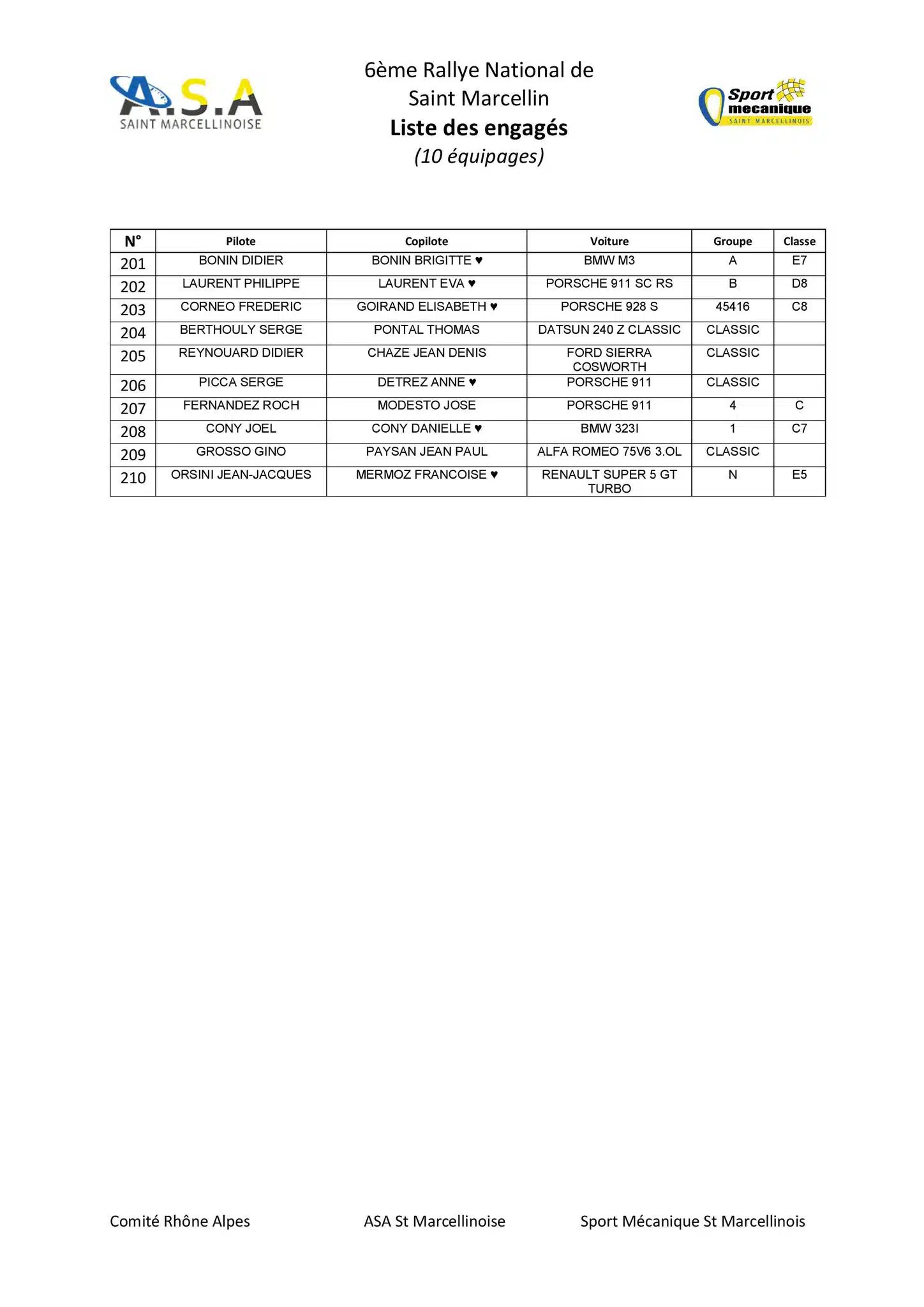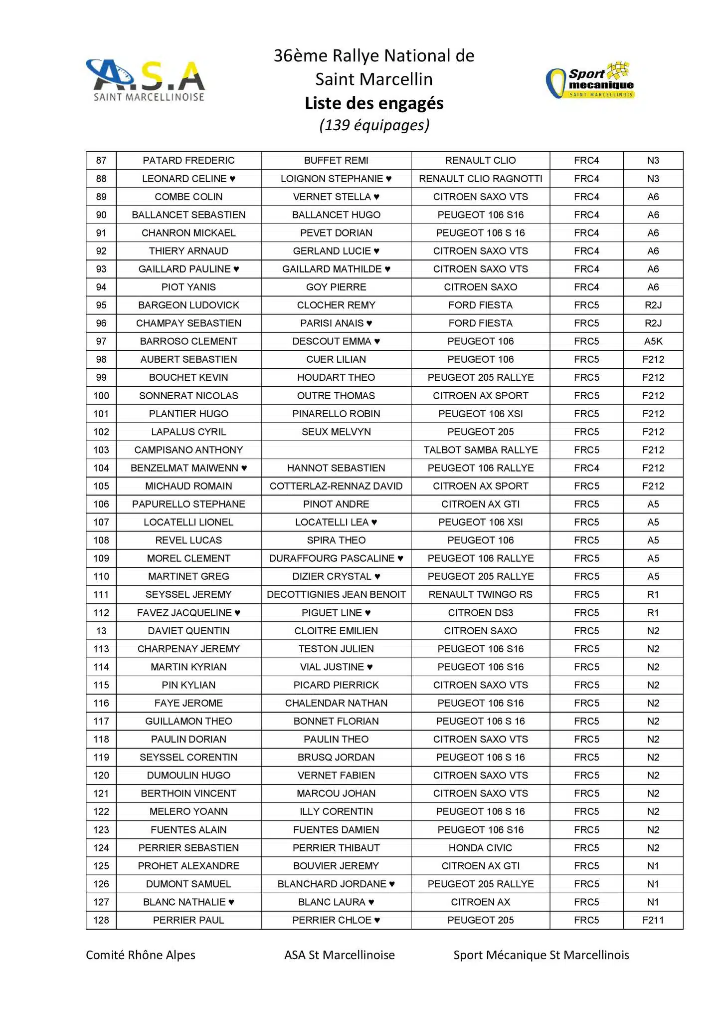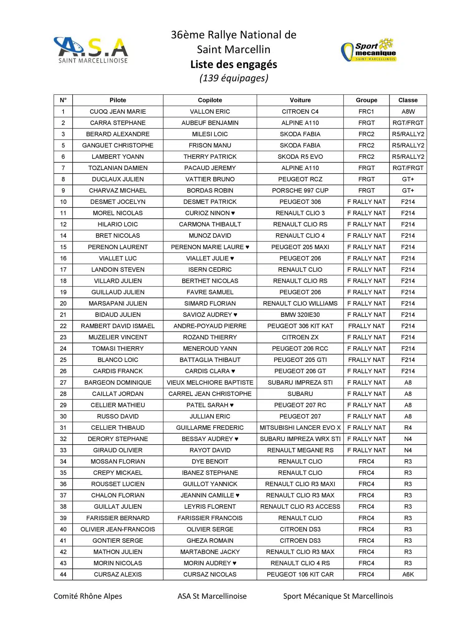 Le Rallye de Saint Marcellin 2024 sera organisé les 5 et 6 juillet 2024 par l’ASA Saint-Marcellinoise et la liste des engagés vient de sortir avec 139 équipages au départ.