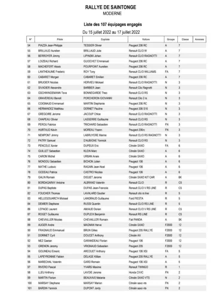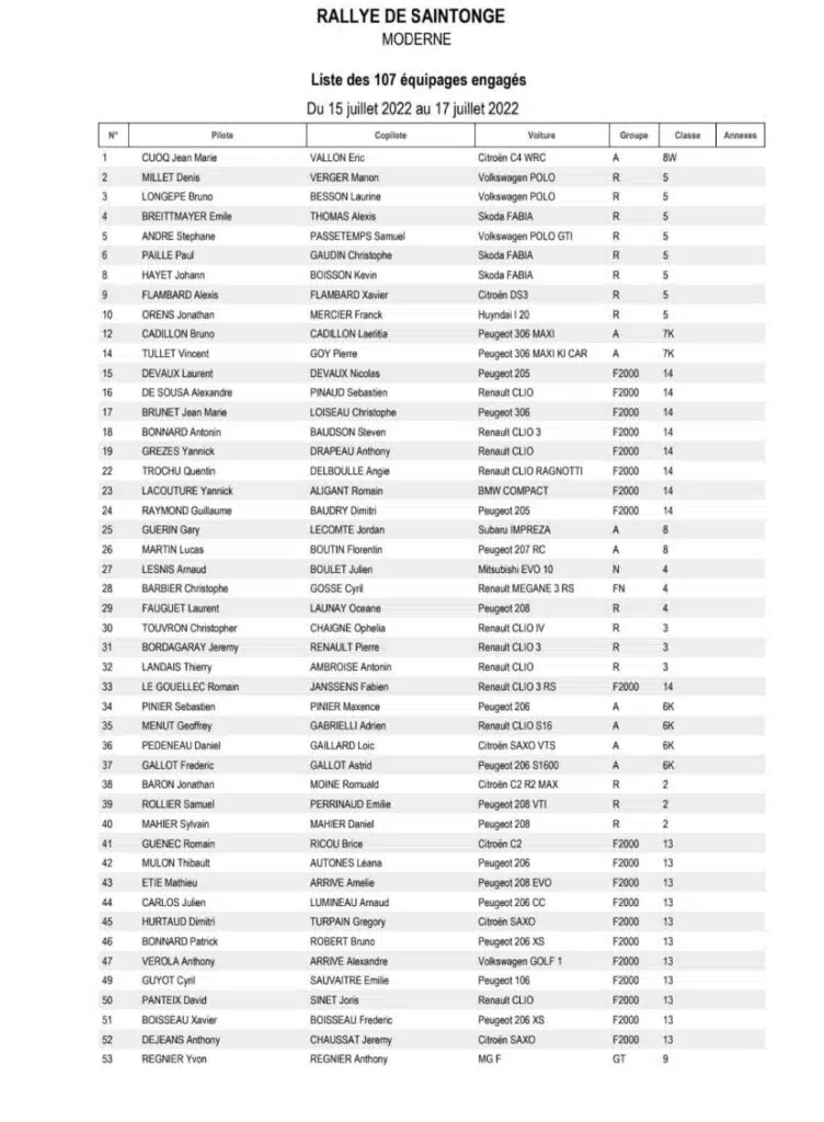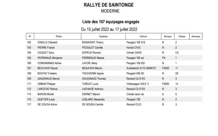 La 33 ème édition du Rallye national de Saintonge & VHC sera organisée du 15 au 17 juillet 2022 par l’ASA de Saintonge avec une seule journée de course et deux spéciales à parcourir 4 fois.