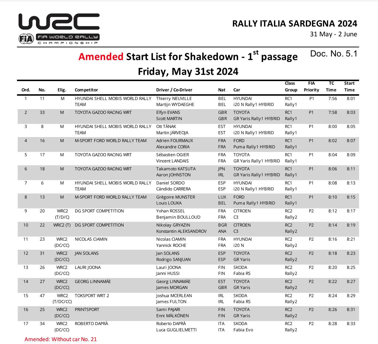Rallye de Sardaigne 2024 : Liste de départ du Shakedown