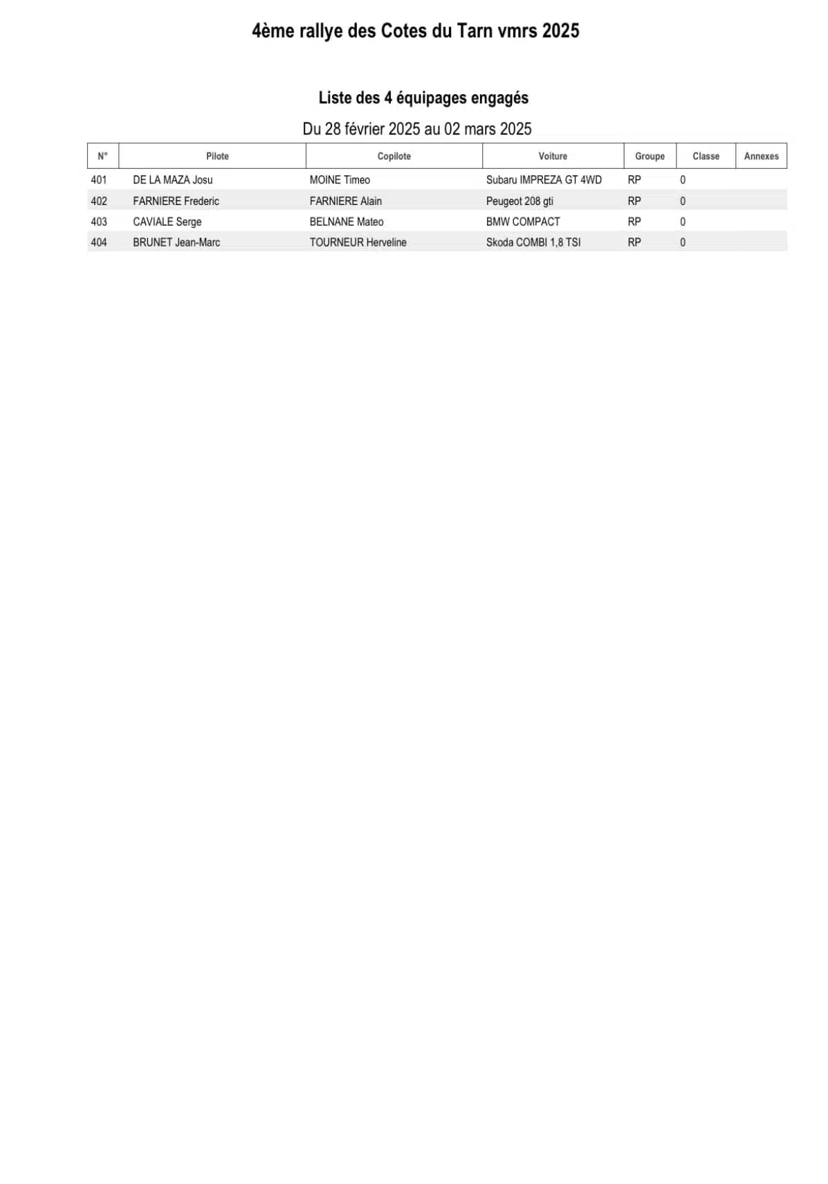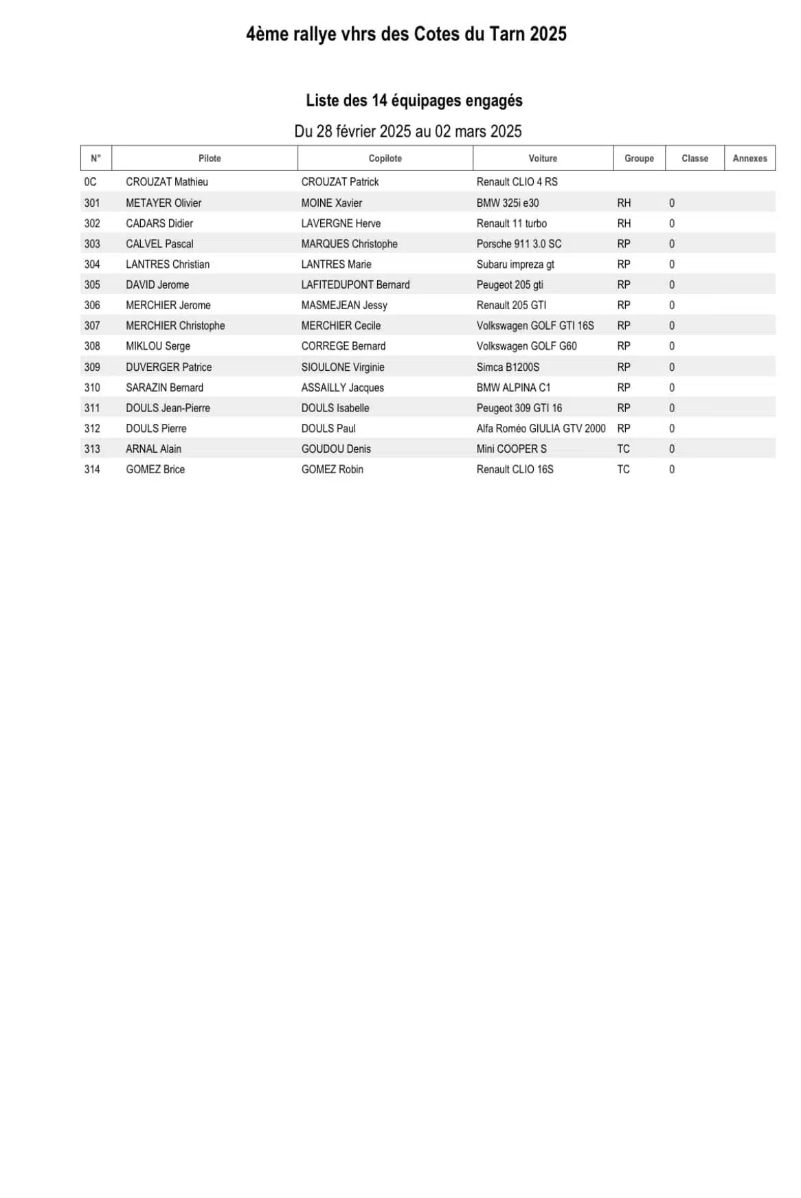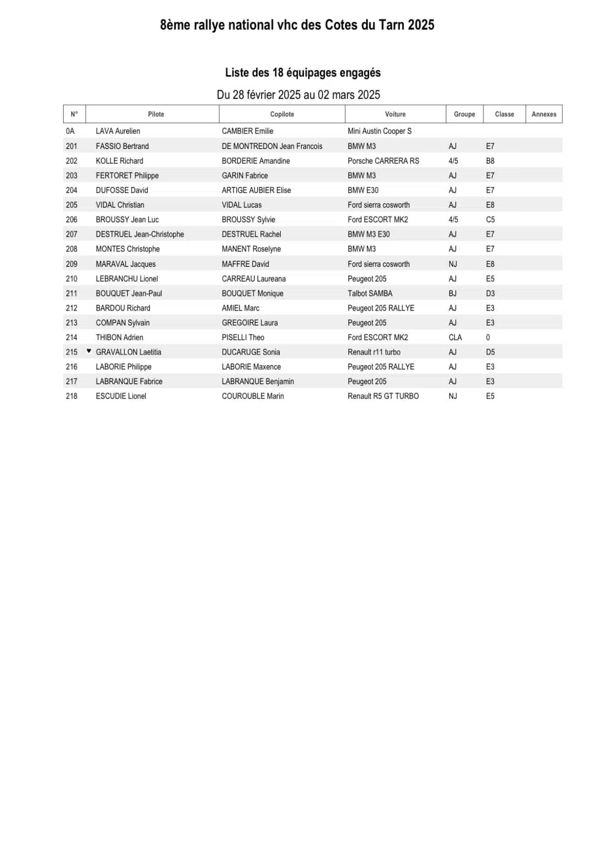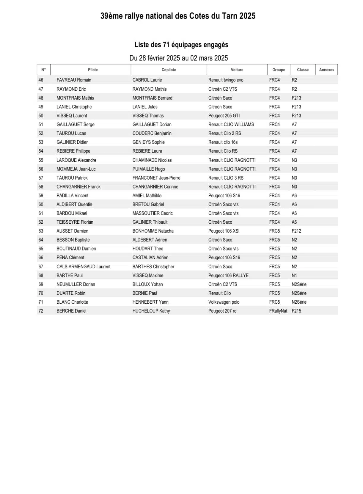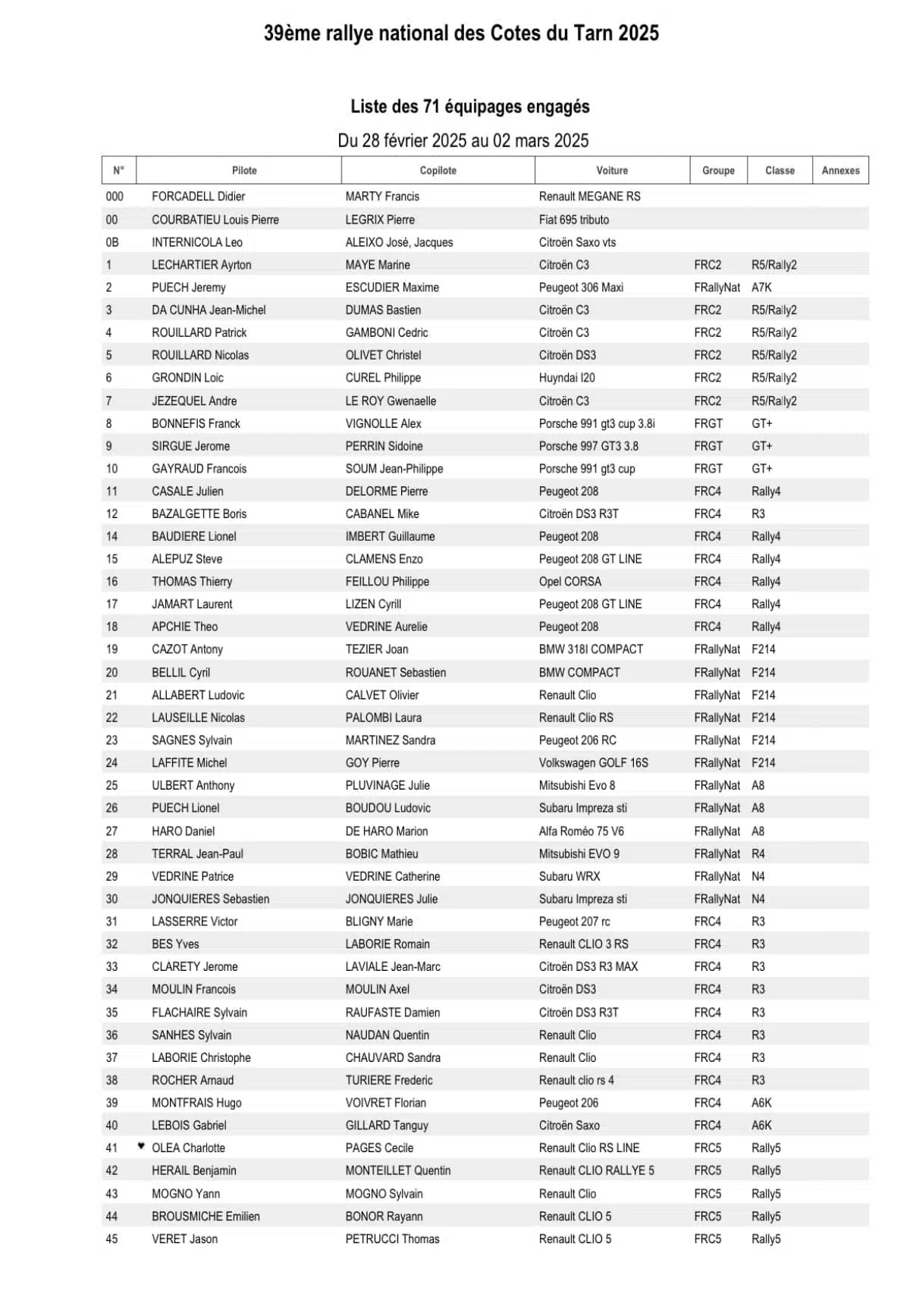 Le Rallye des Côtes du Tarn 2025 sera organisé les 1er et 2 mars 2025 par l’ASA du Vignoble Tarnais et l’Écurie des 2 Rives et la liste des engagés vient d’être publiée avec 71 équipages engagés en moderne.