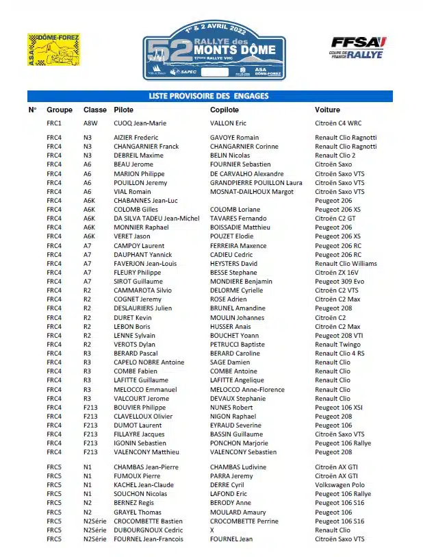La 52ème édition du Rallye national des Monts Dôme & VHC sera organisée les 1er et 2 avril 2022 par l’ASA Dôme Forez, ligue Auvergne sur un parcours de 226,500 kms. Rallye national des Monts Dôme sera divisé en trois sections sur une étape. Il comporte 6 épreuves spéciales d’une longueur totale de 112,900 kms chronométrés.
