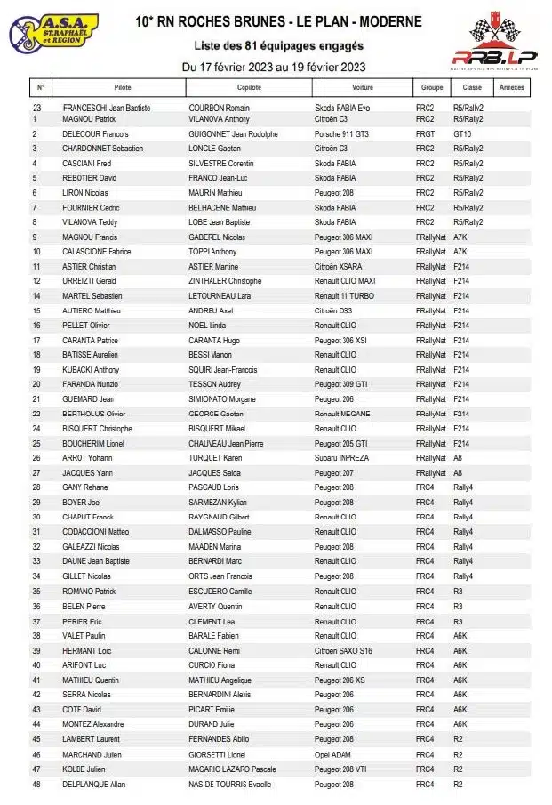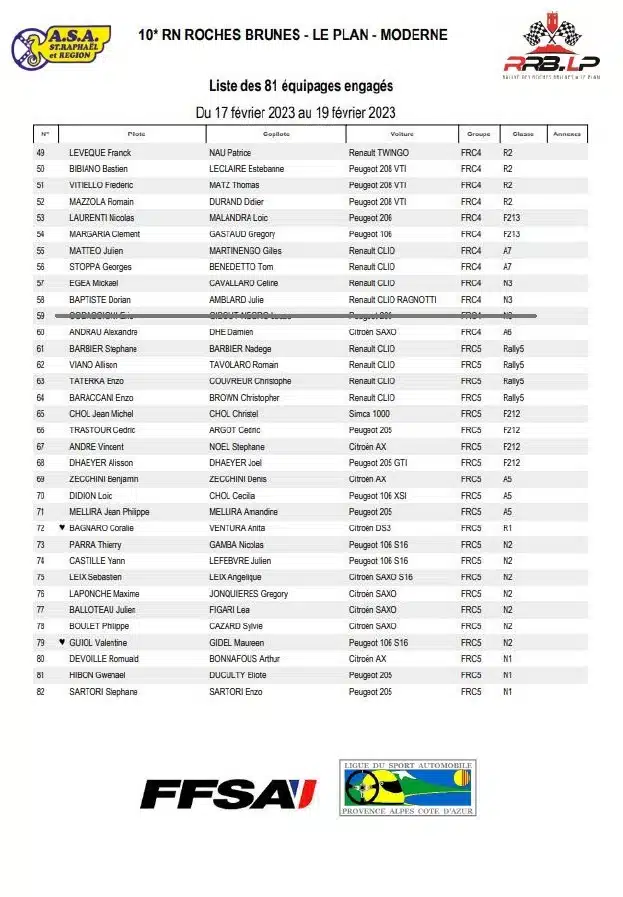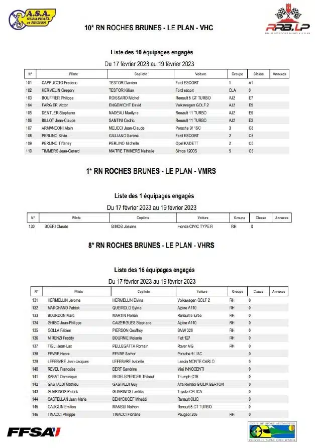 Le 10 ème Rallye des ROCHES BRUNES – LE PLAN, se déroulera les 17, 18 et 19 Février 2023 sur un parcours de 433.71 km et comptera pour la coupe de France des Rallyes 2023 Nationaux, coefficient 3 et les challenges Rallyes 2023 de la ligue du Sport Automobile Provence Alpes Côte d’Azur.
