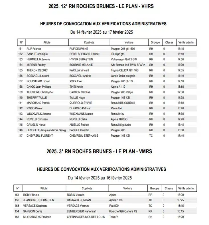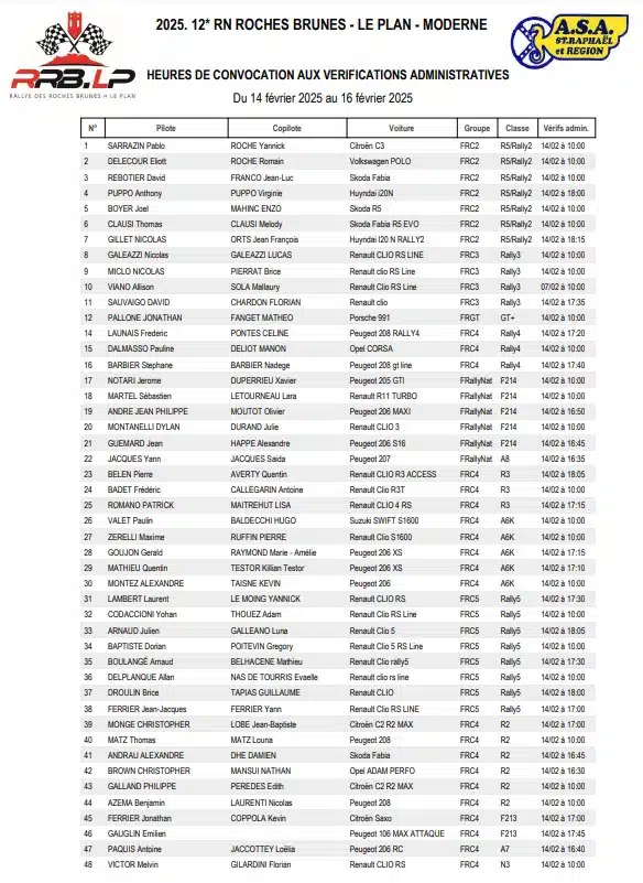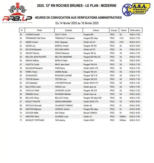 Rallye des Roches Brunes – Le Plan 2025 – Liste des engagés