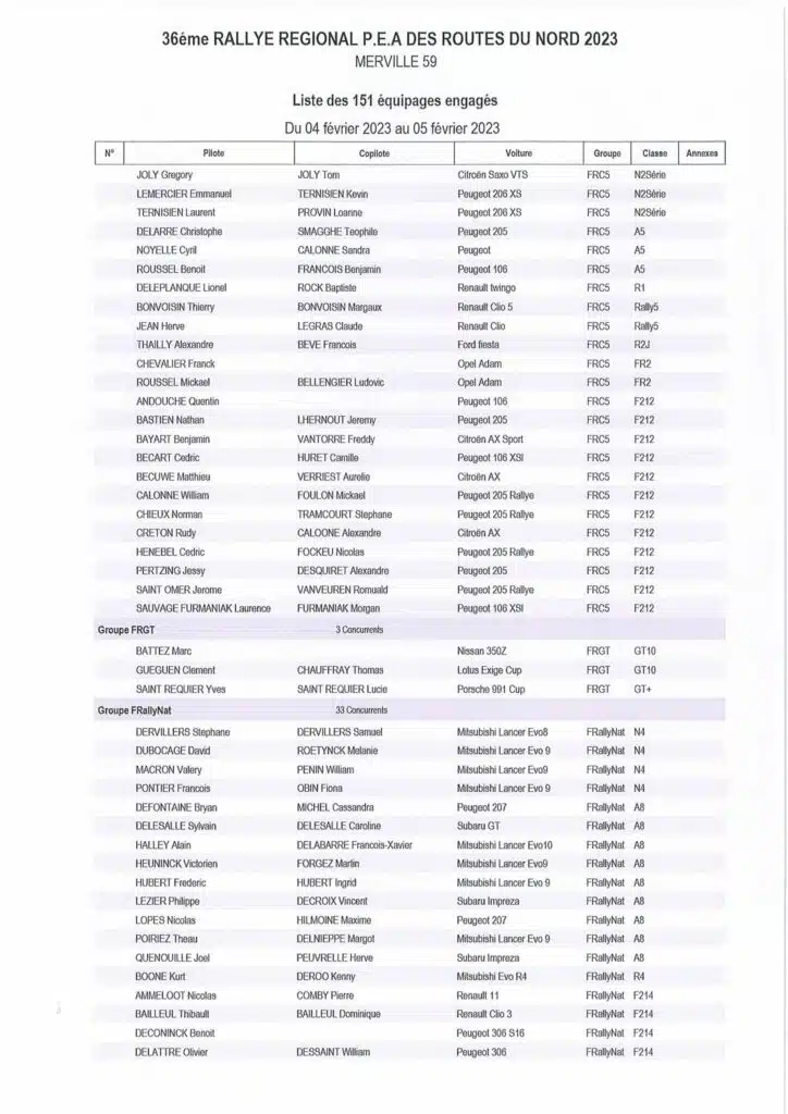 La 36 ème édition du Rallye des routes du Nord 2023 se déroulera les 4 et 5 Février 2023 sur la commune de Merville.