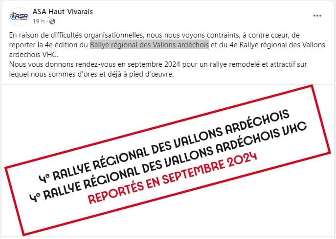 La 4 ème édition du Rallye régional des Vallons Ardéchois & VHC qui devait être organisée les 15 et 16 septembre 2023 par l’ASA Haut Vivarais ne ne se fera pas. Effectivement, les organisateurs ont annoncé que l’édition 2023 ne se fera pas et est reportée à 2024 face à des difficultés organisationnelles.