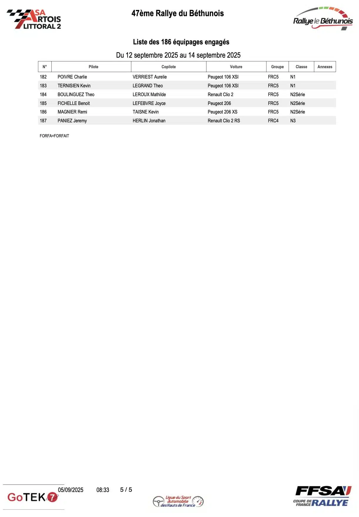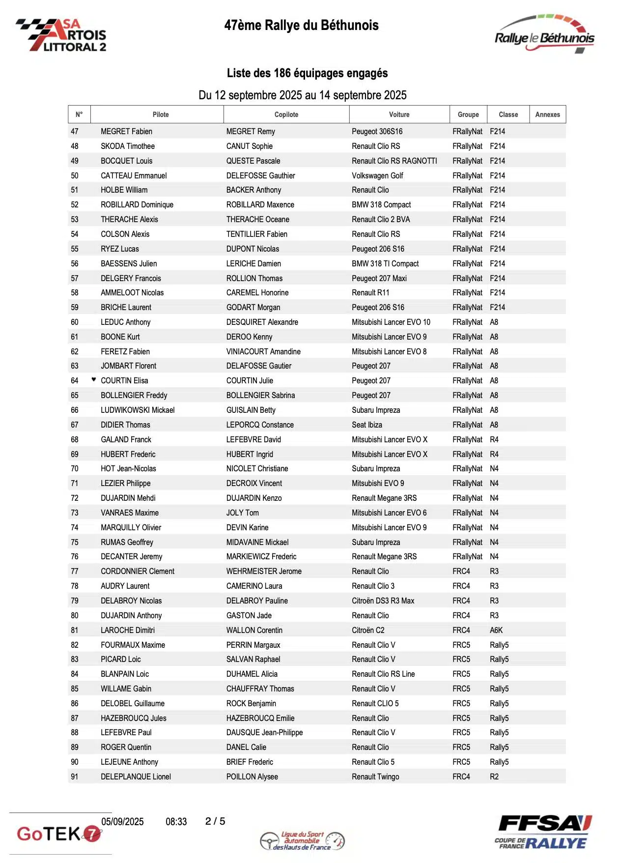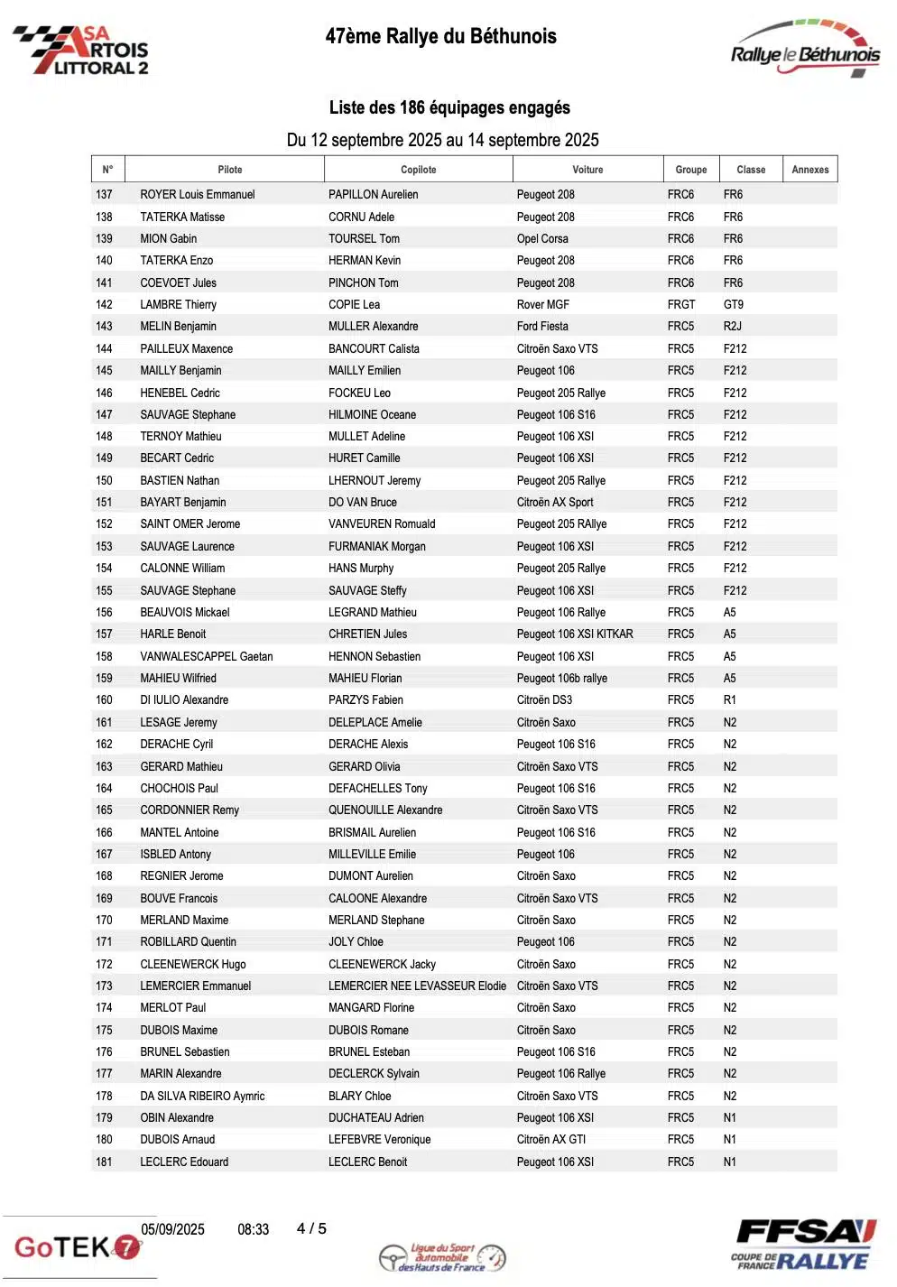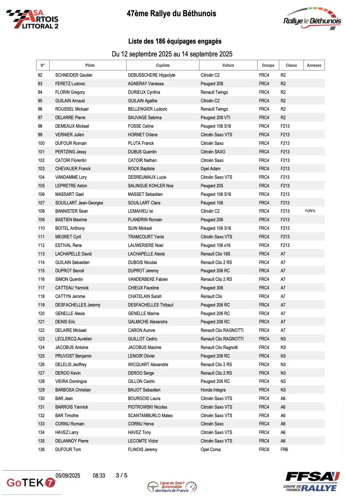 Le Rallye du Béthunois 2025 sera organisé du 12 au 14 septembre 2025 par l’ASA Artois Littoral II et le Stade Béthunois Automobile avec au programme douze spéciales et la liste des engagés est disponible.