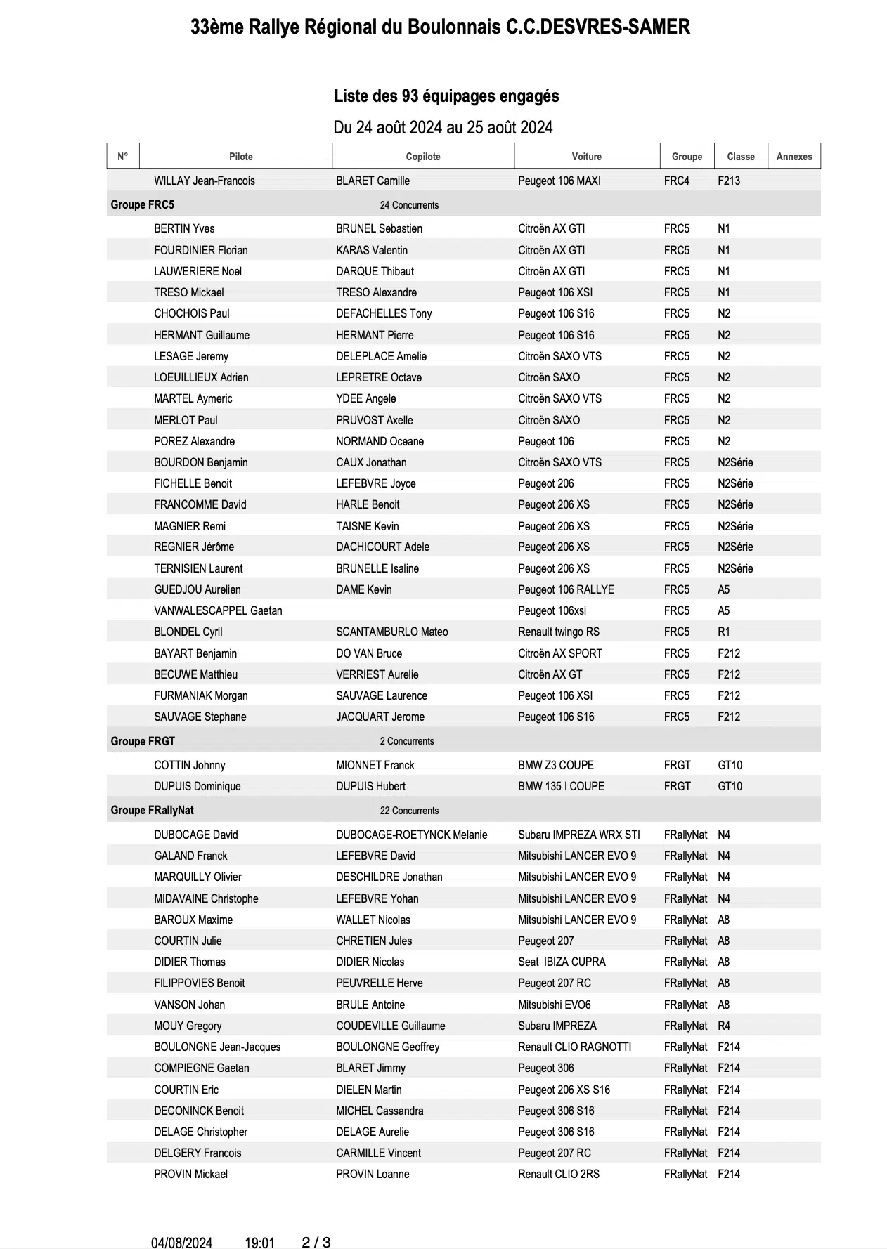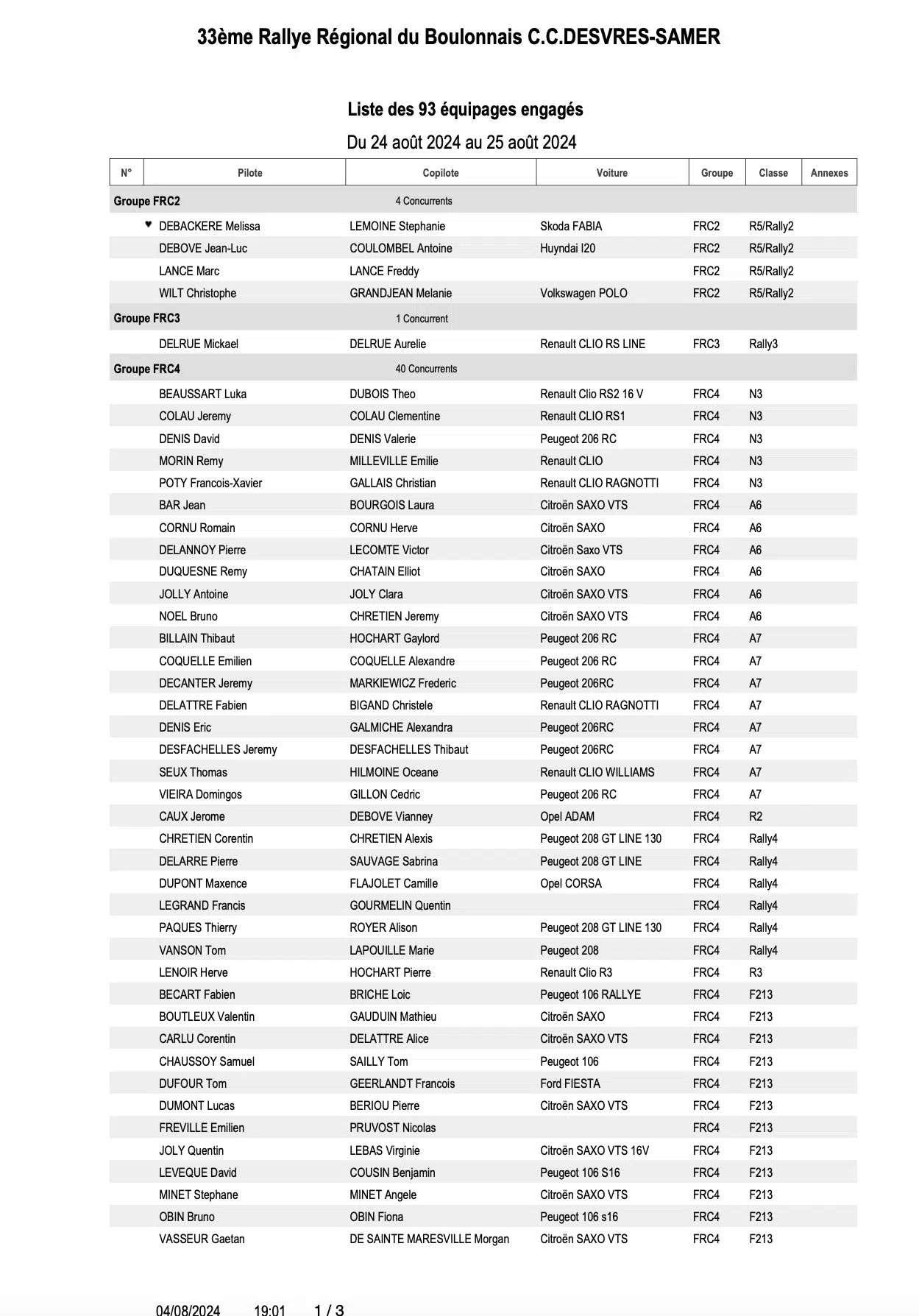 Le Rallye du Boulonnais 2024 sera organisé les 23 et 24 août 2024 par l’ASA du Détroit et l’Auto Club Côte d’Opale et la liste des engagés vient d’être publiée.