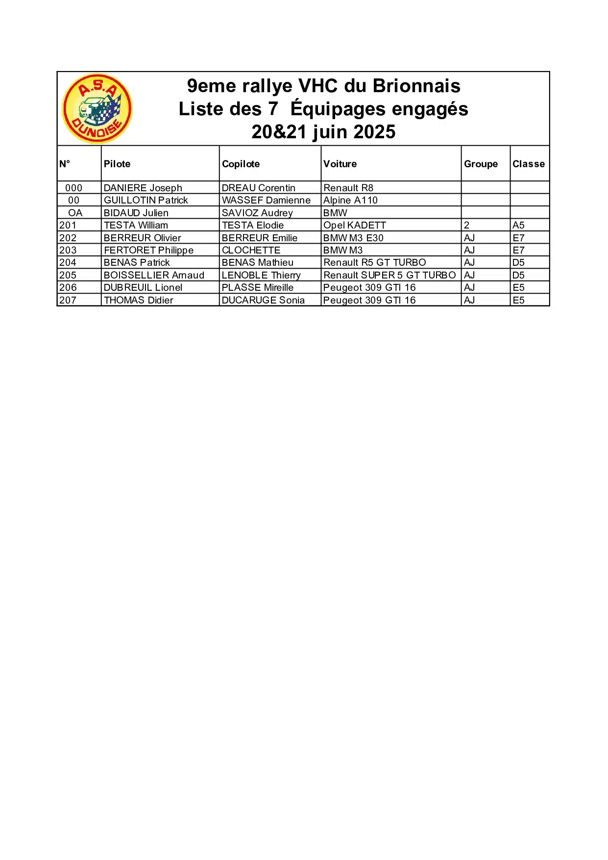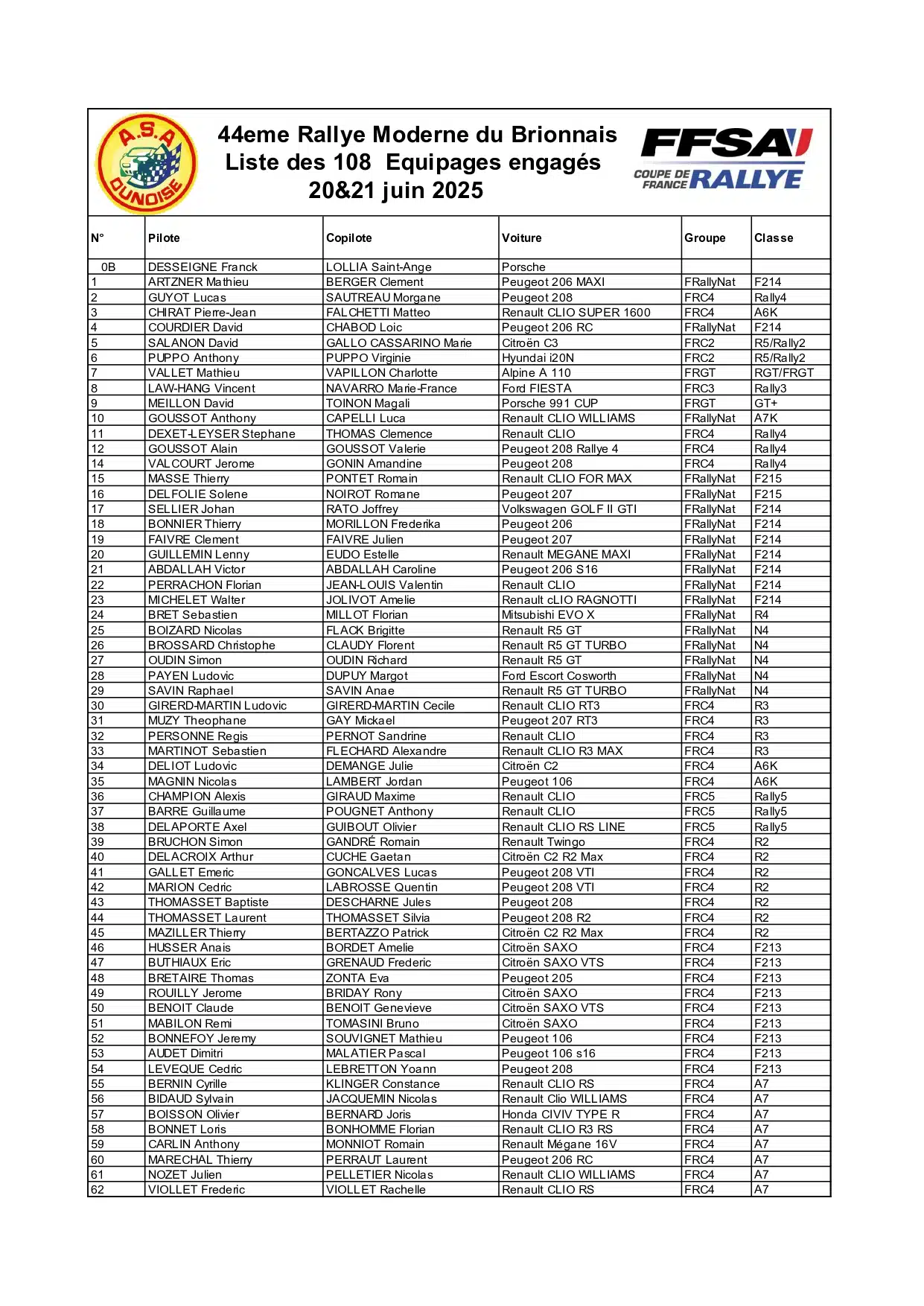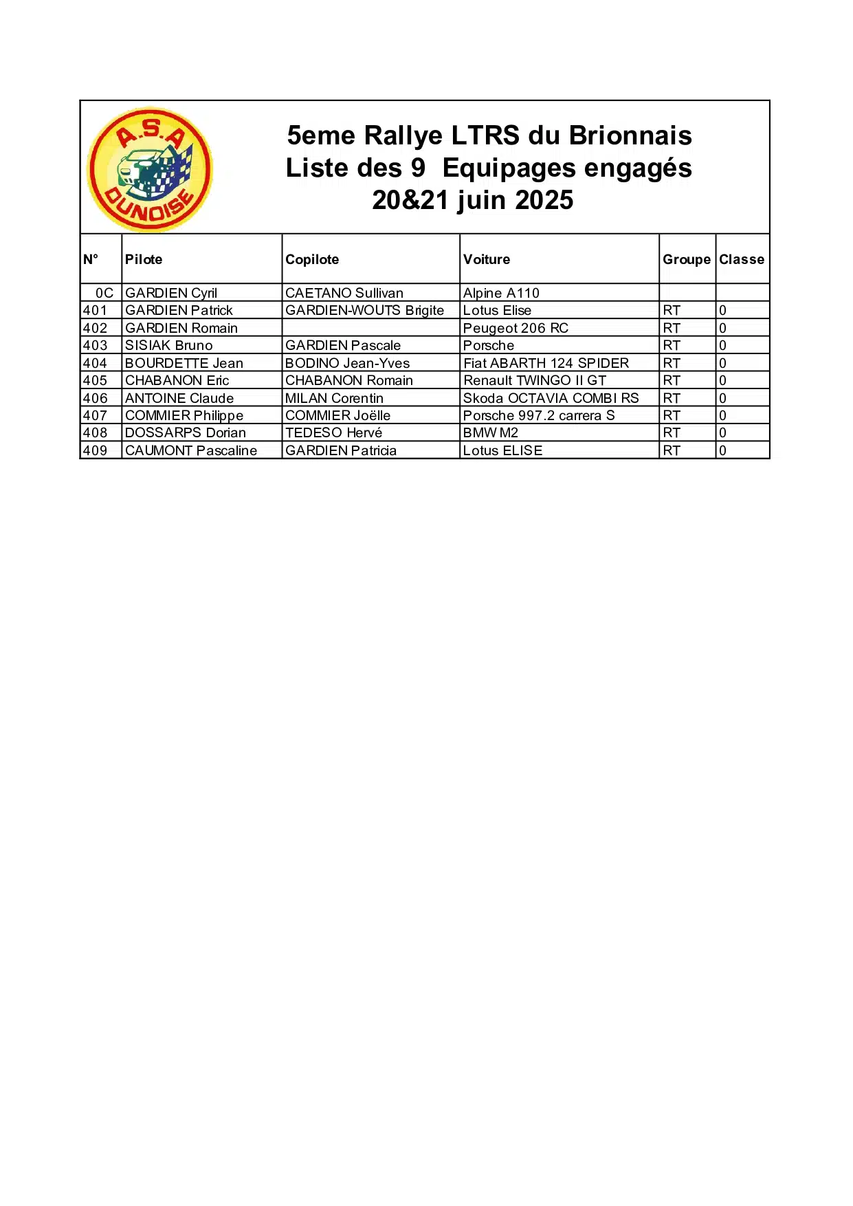 Le Rallye du Brionnais 2025 sera organisé les 20 et 21 juin 2025 par l’ASA Dunoise avec au programme six spéciales et la liste des engagés vient d’être publiée avec 108 équipages inscrits.