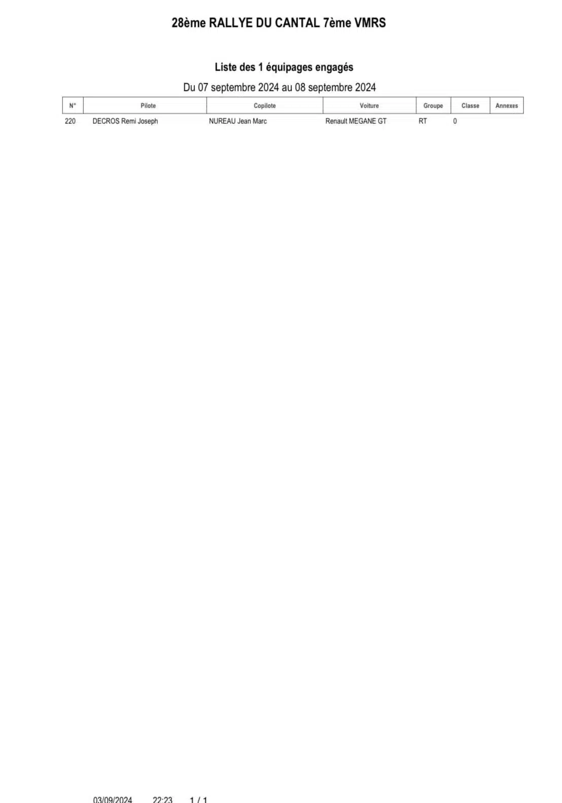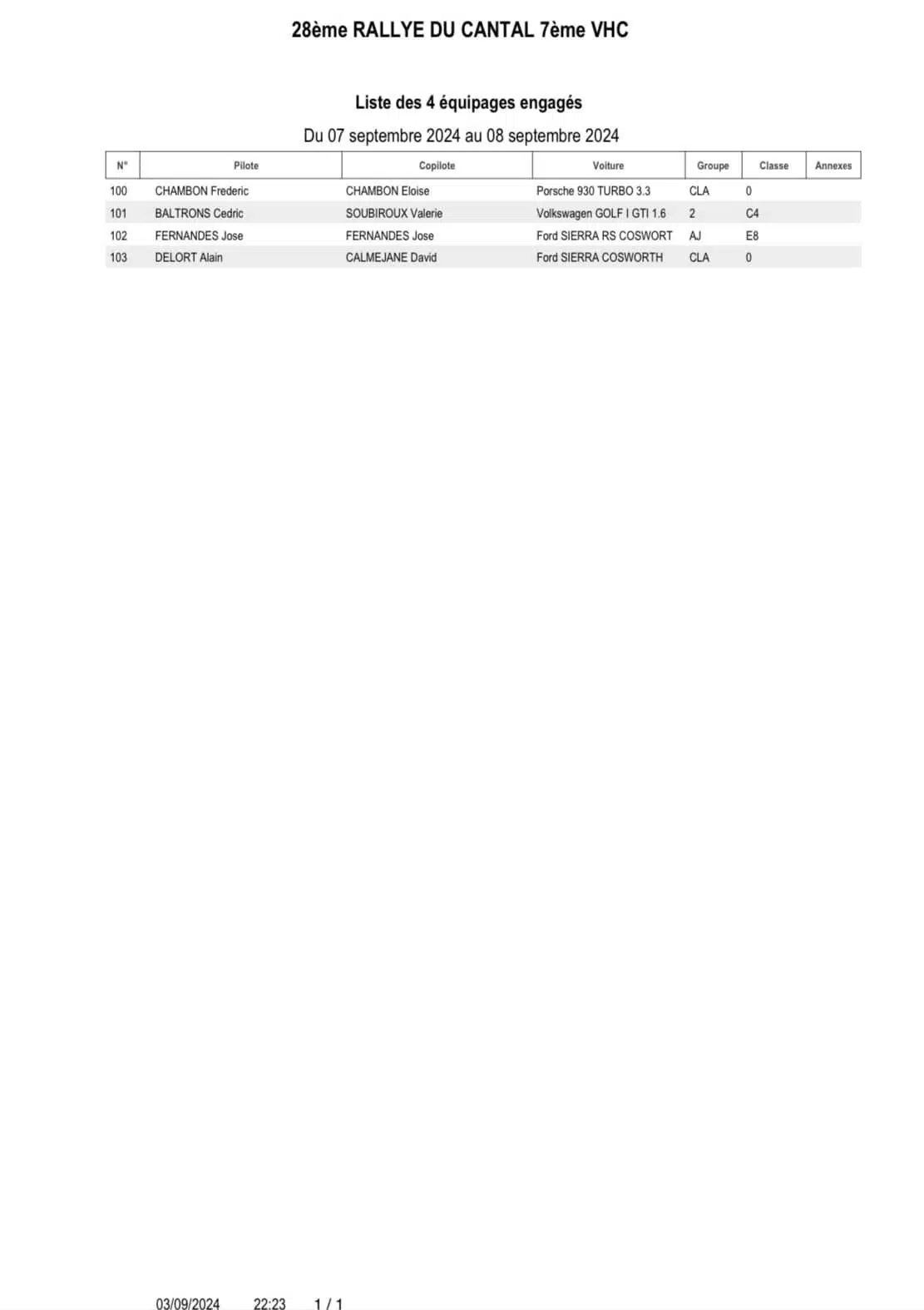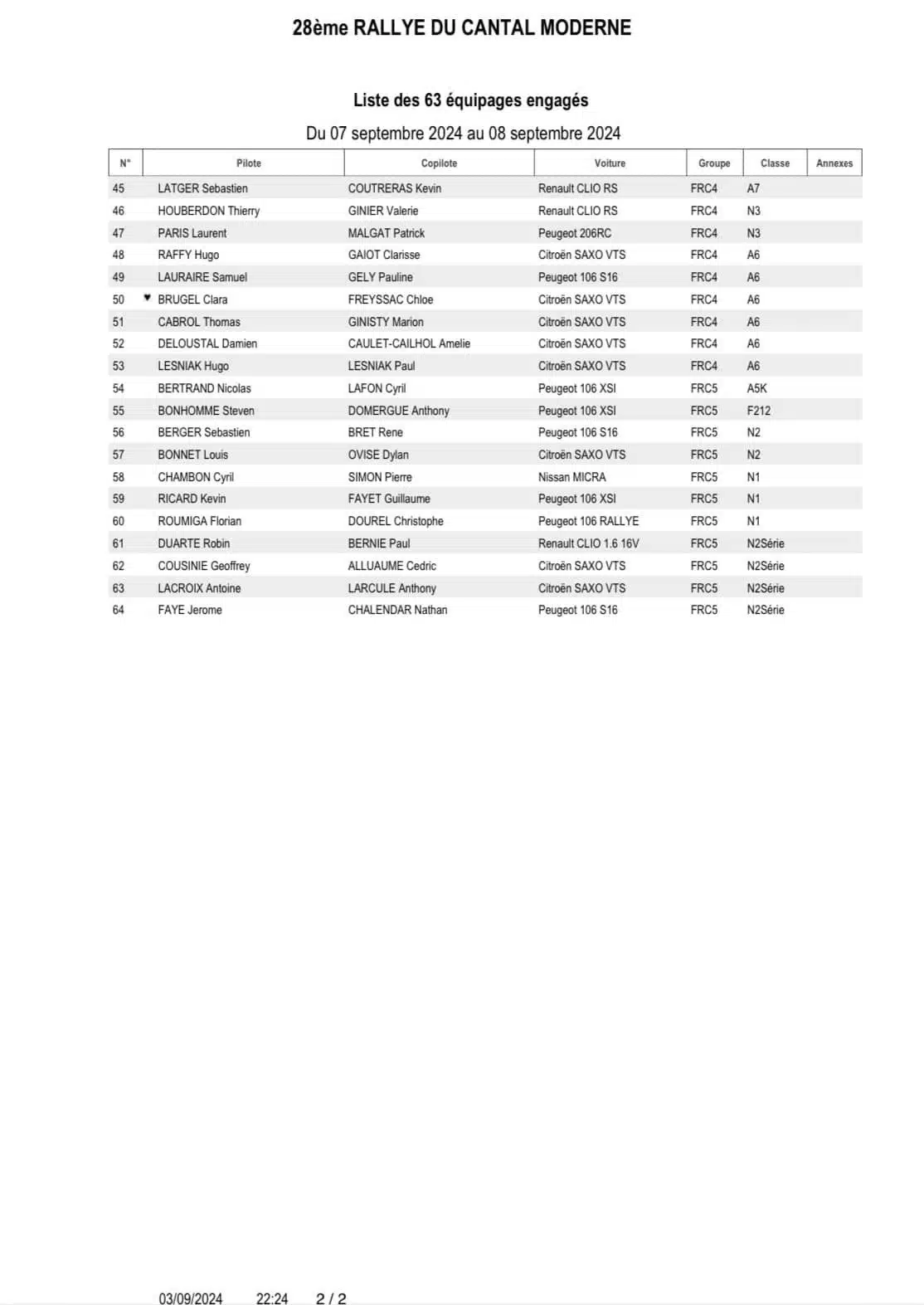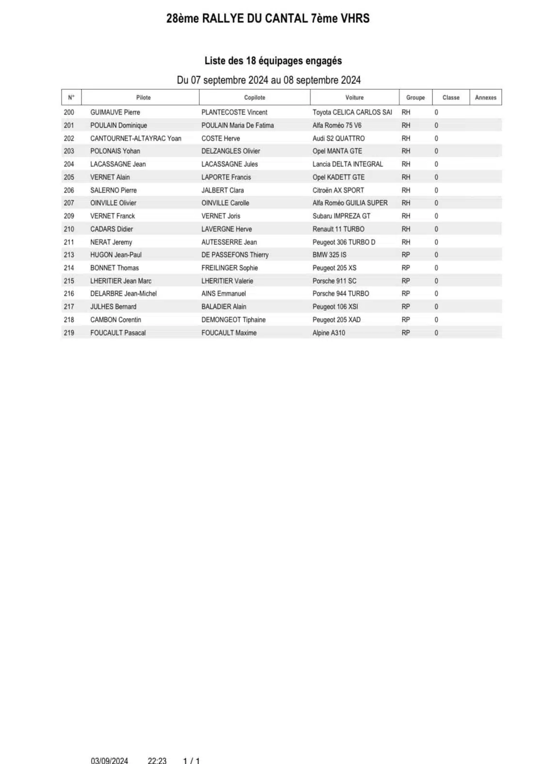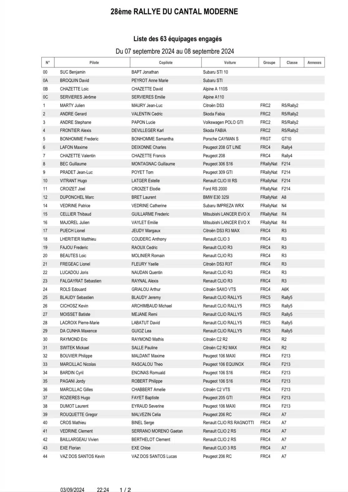 Le Rallye du Cantal 2024 sera organisé les 7 et 8 septembre 2024 par l’ASAC d’Auvergne et l’Écurie des Volcans avec six spéciales au programme et la liste des engagés vient de sortir avec 63 équipages engagés en moderne.