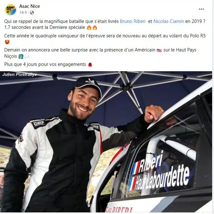 Le Rallye du Haut Pays Niçois 2021 se déroulera le week – end des 12 et 13 Novembre et si déjà quelques noms sont annoncés comme Calascione, Latela, Pistachi, Casciani, Desmoulin ou encore Arzéno qui devrait être présent, l’Asac Nice a confirmé la présence de Bruno Riberi au volant de la Polo R5. Face à lui Nicolas Ciamin le tenant du titre sera présent aussi et le duel de 2019 pourrait bien avoir une revanche à moins que Mathieu Arzéno ou une surprise Américaine vienne semer le trouble dans ce duel déjà annoncé…