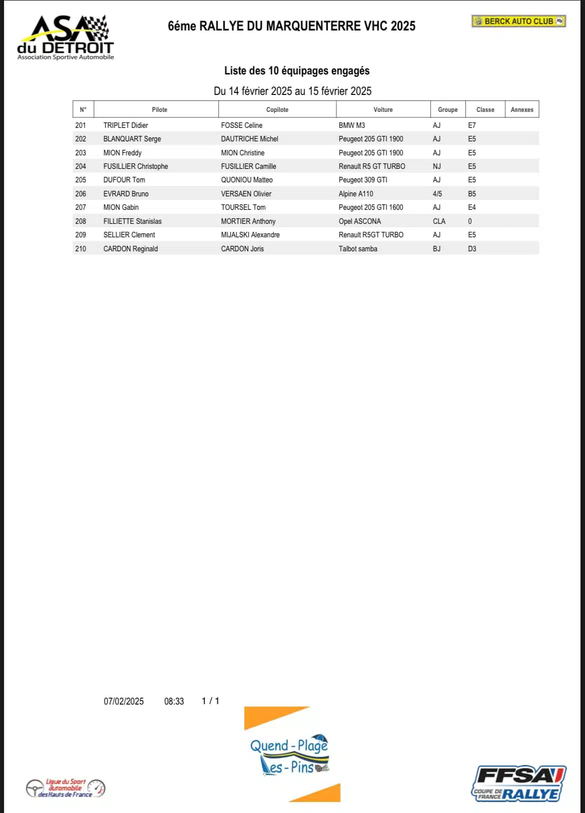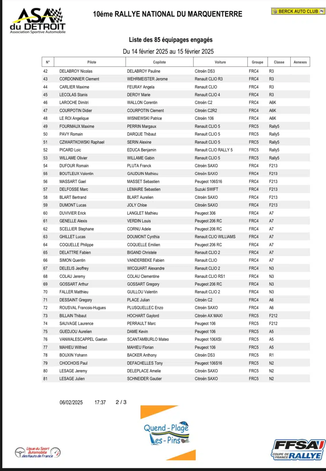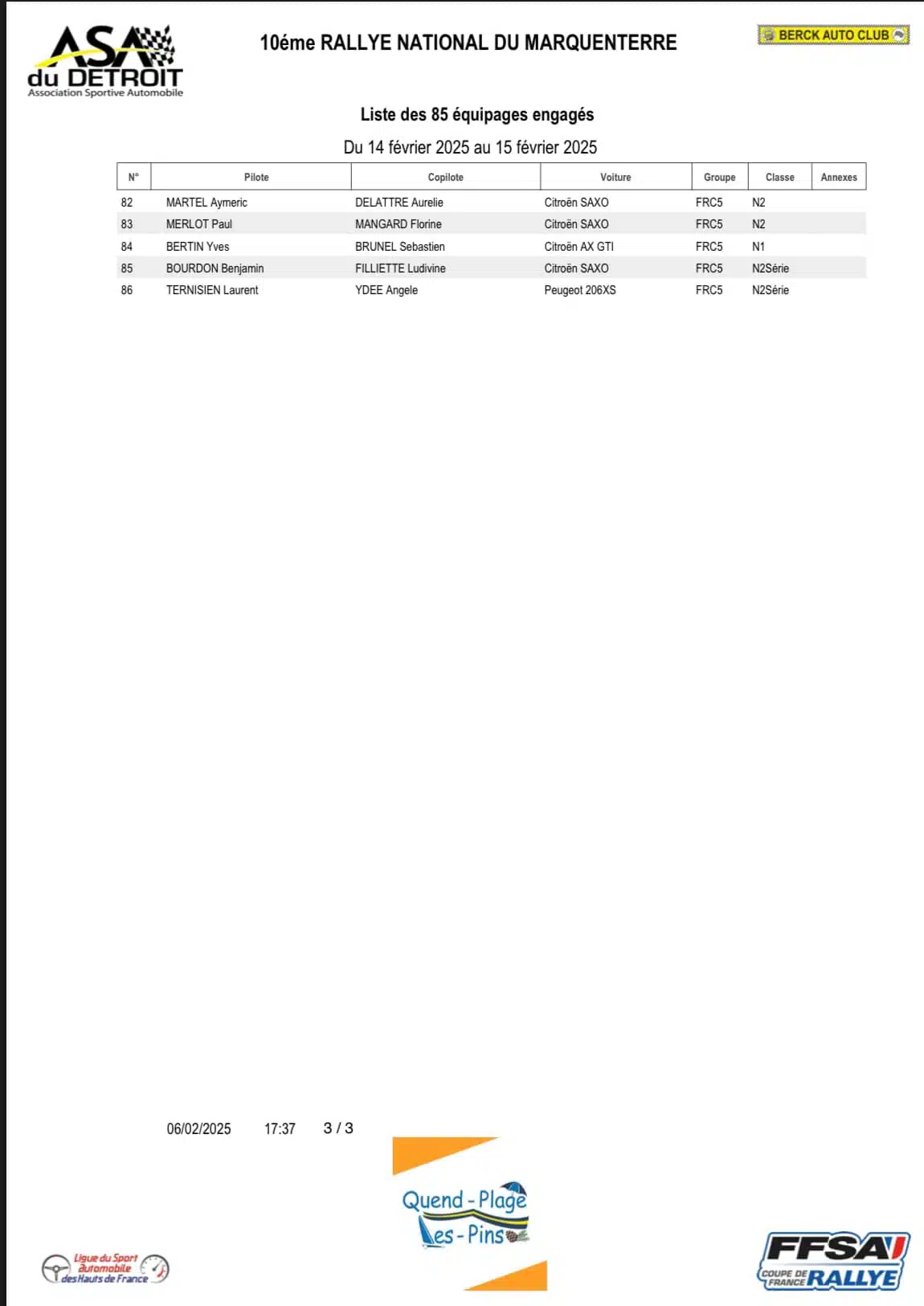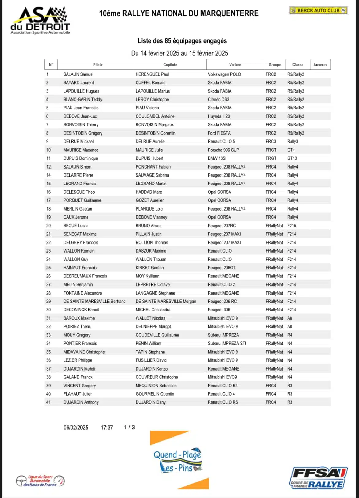 Le Rallye du Marquenterre 2025 sera organisé les 14 et 15 février 2025 par l’ASA du Détroit et le Berck Auto Club avec au programme neuf spéciales et la liste des engagés est disponible.