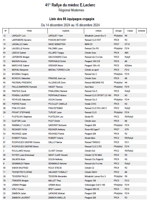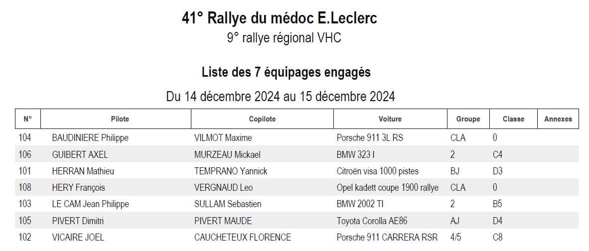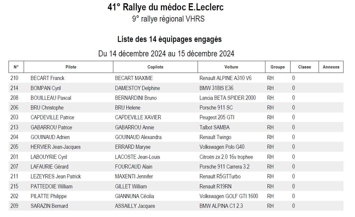 Le Rallye du médoc 2024 sera organisé les 14 et 15 décembre 2024 par l’ASAC du Sud-Ouest avec au programme quatre spéciales et la liste des engagés vient de sortir avec seulement 86 équipages en moderne.