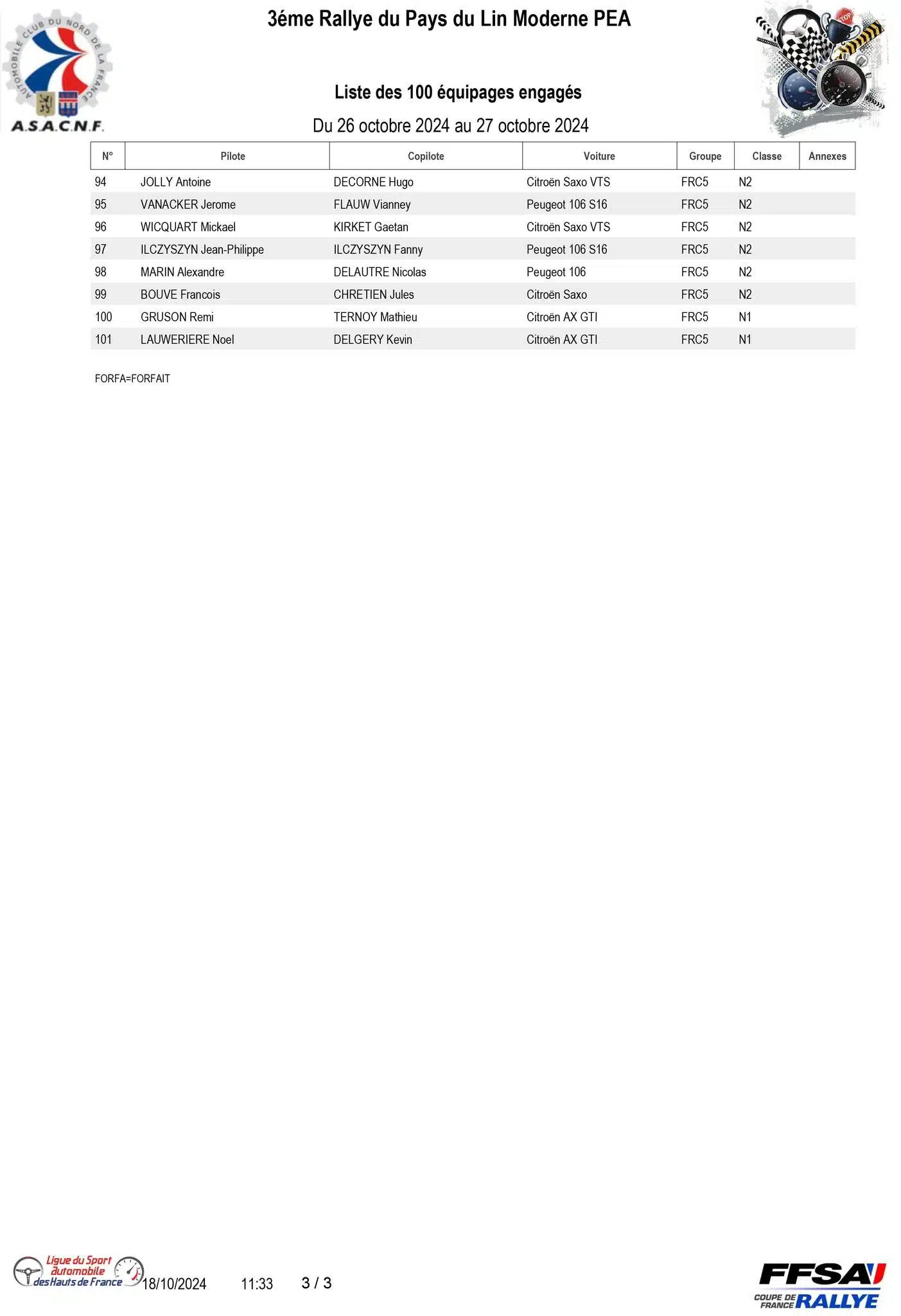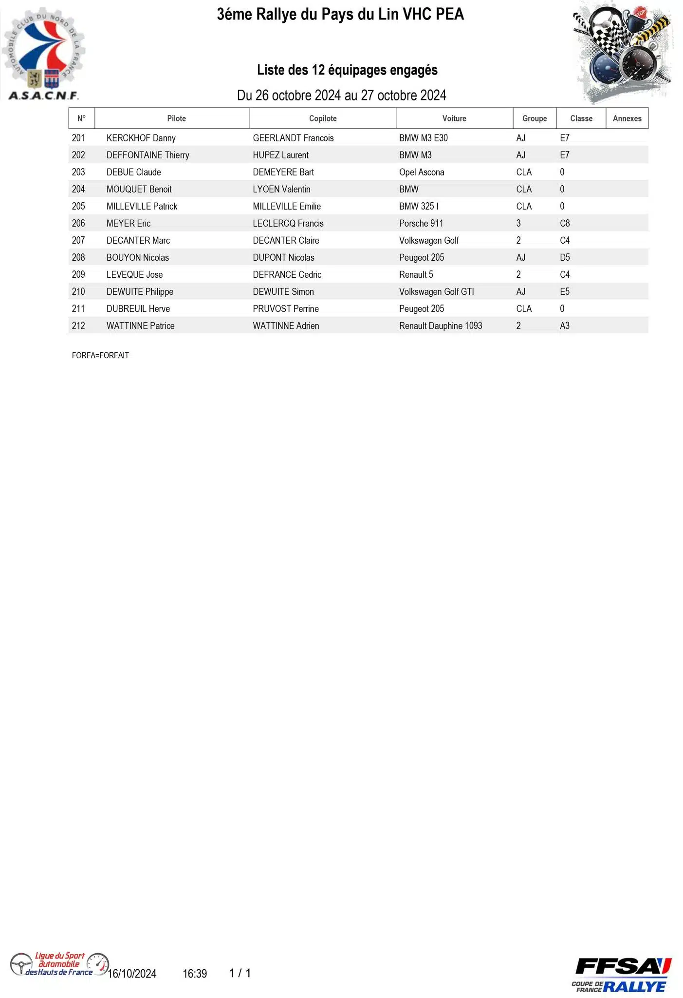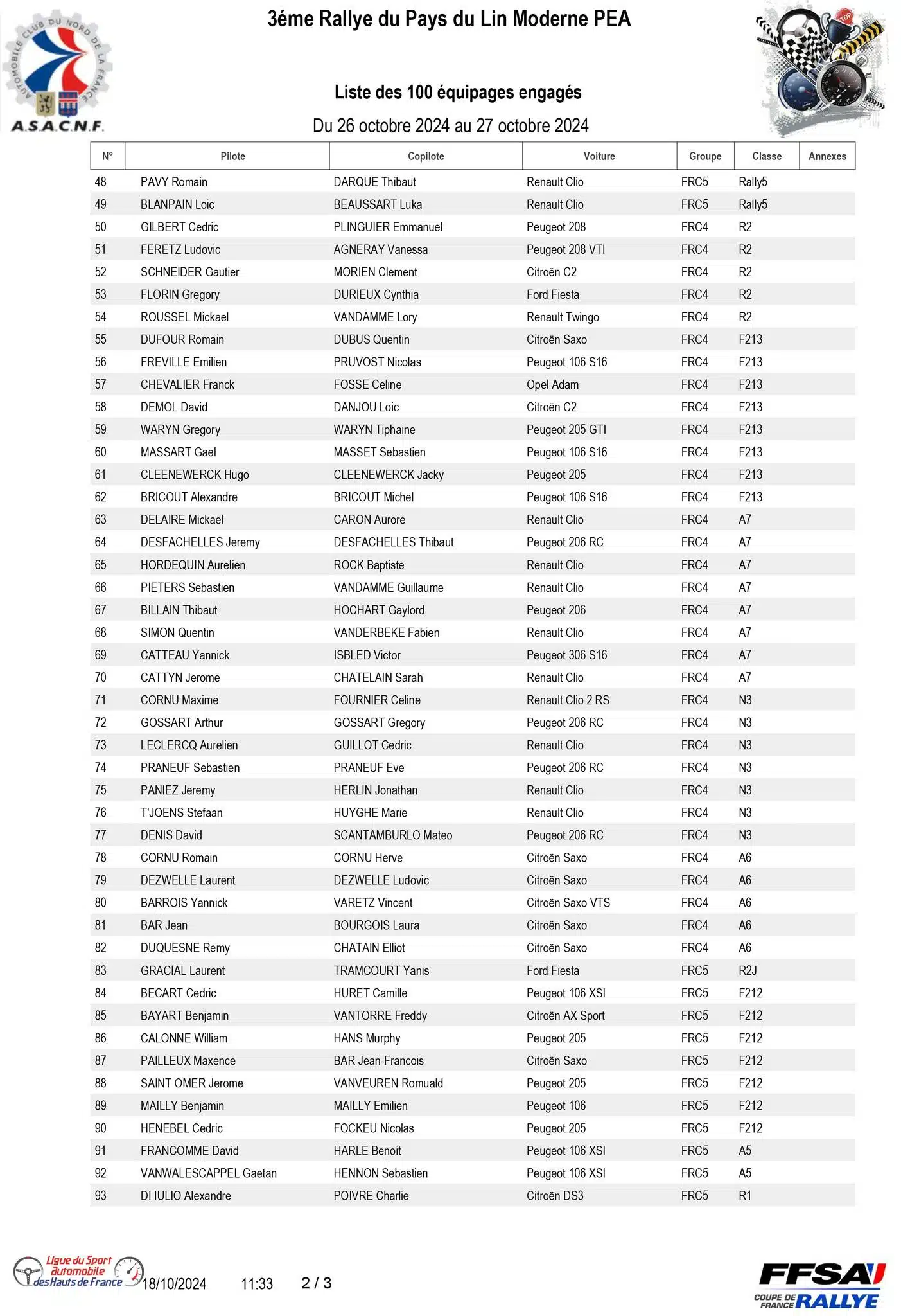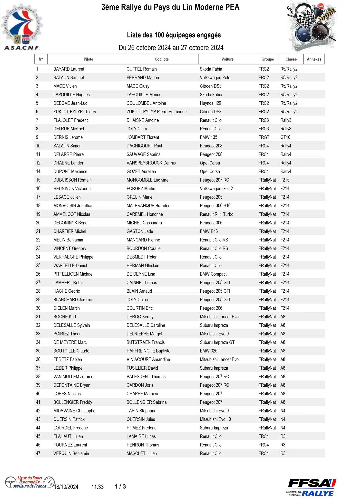 Rallye du Pays du Lin 2024 : Liste des engagés